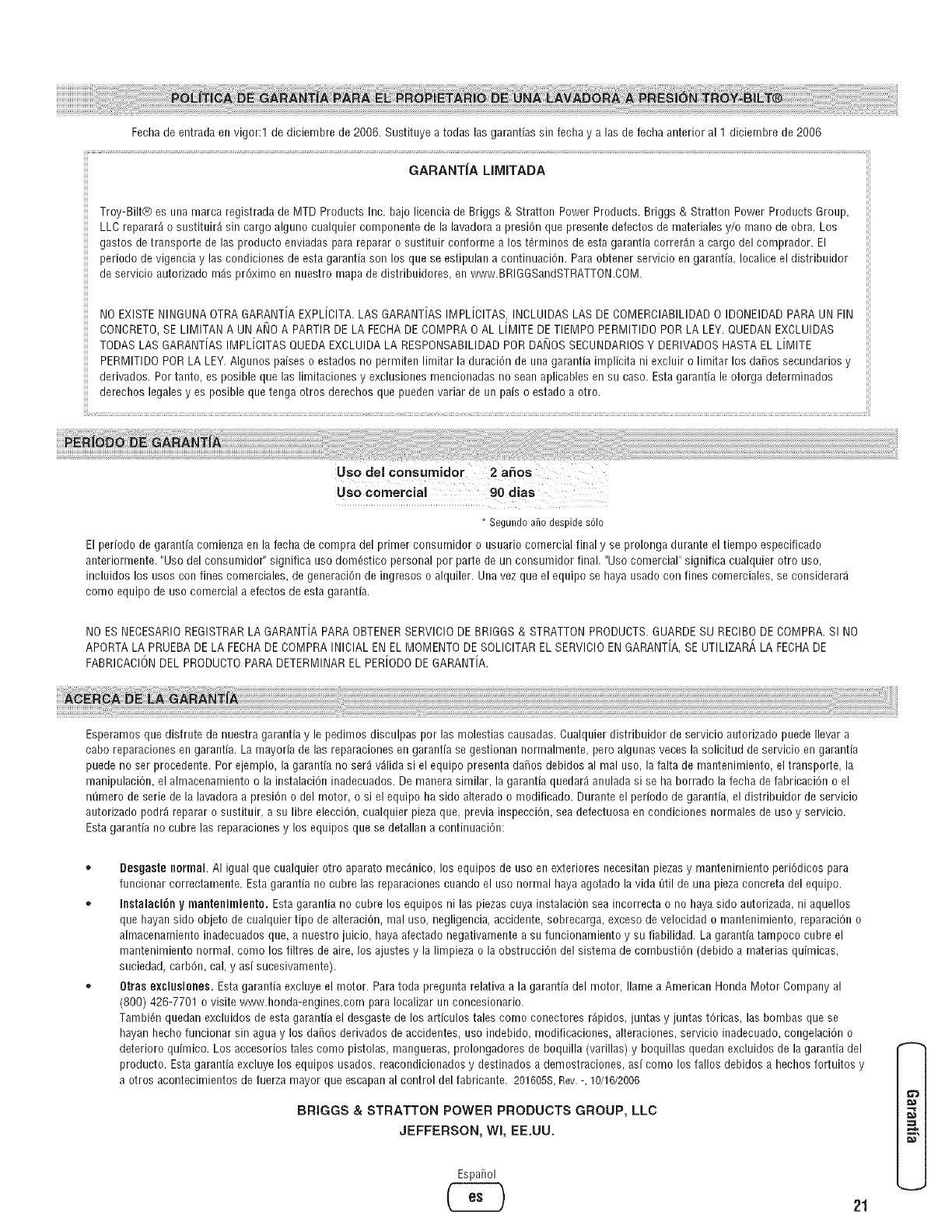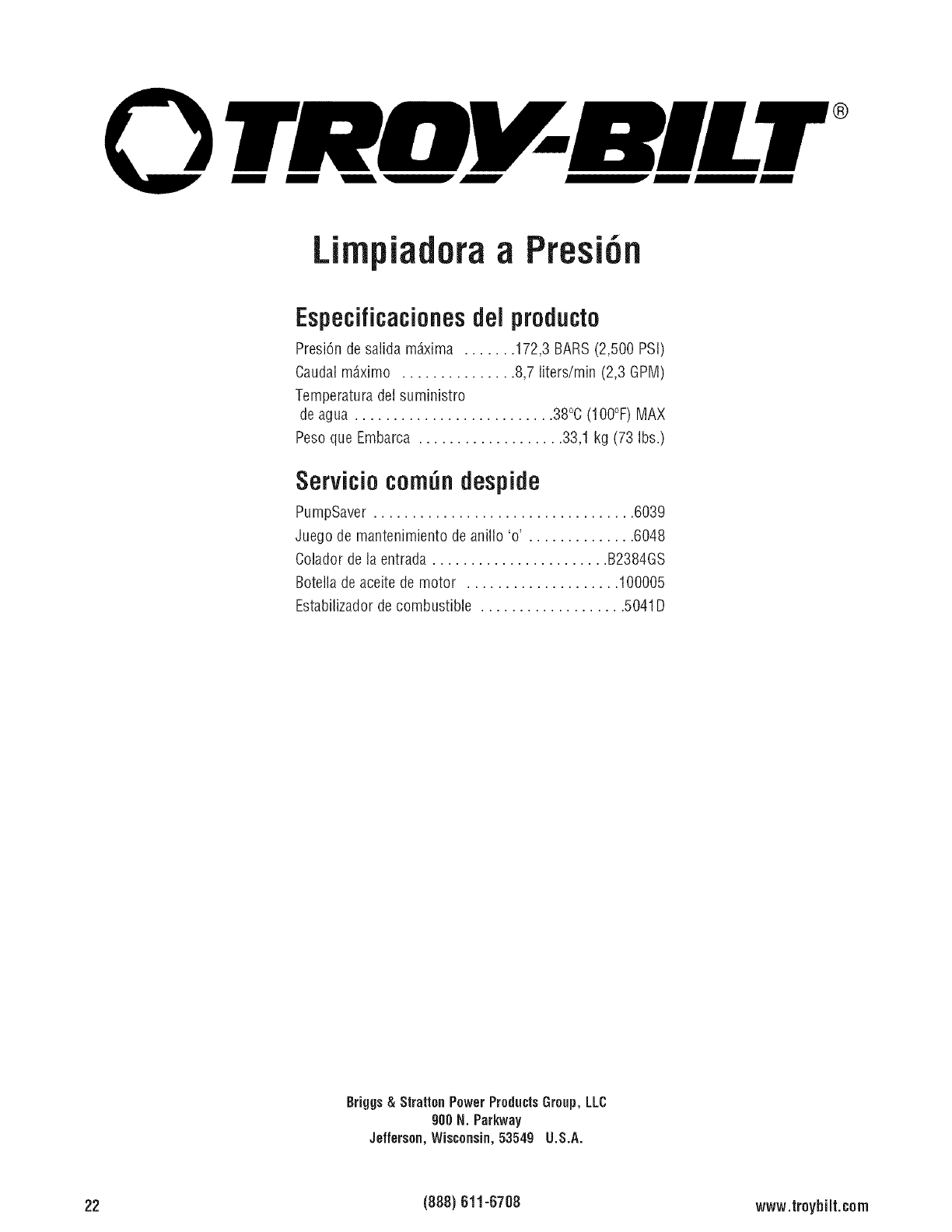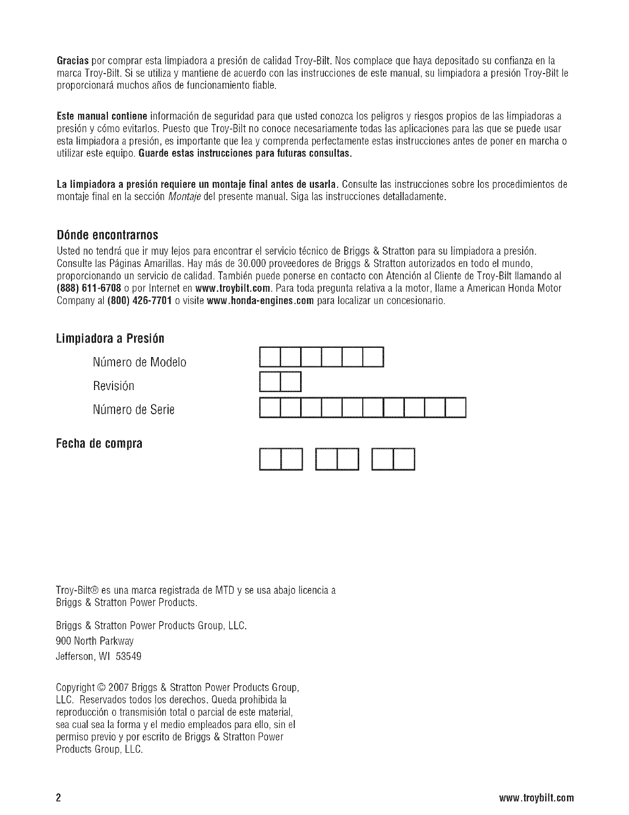 Troy-Bilt® es una marca registrada de MTD Products Inc. bajo licencia de Briggs & Stratton Power Products. Briggs & Stratton Power Products Group,