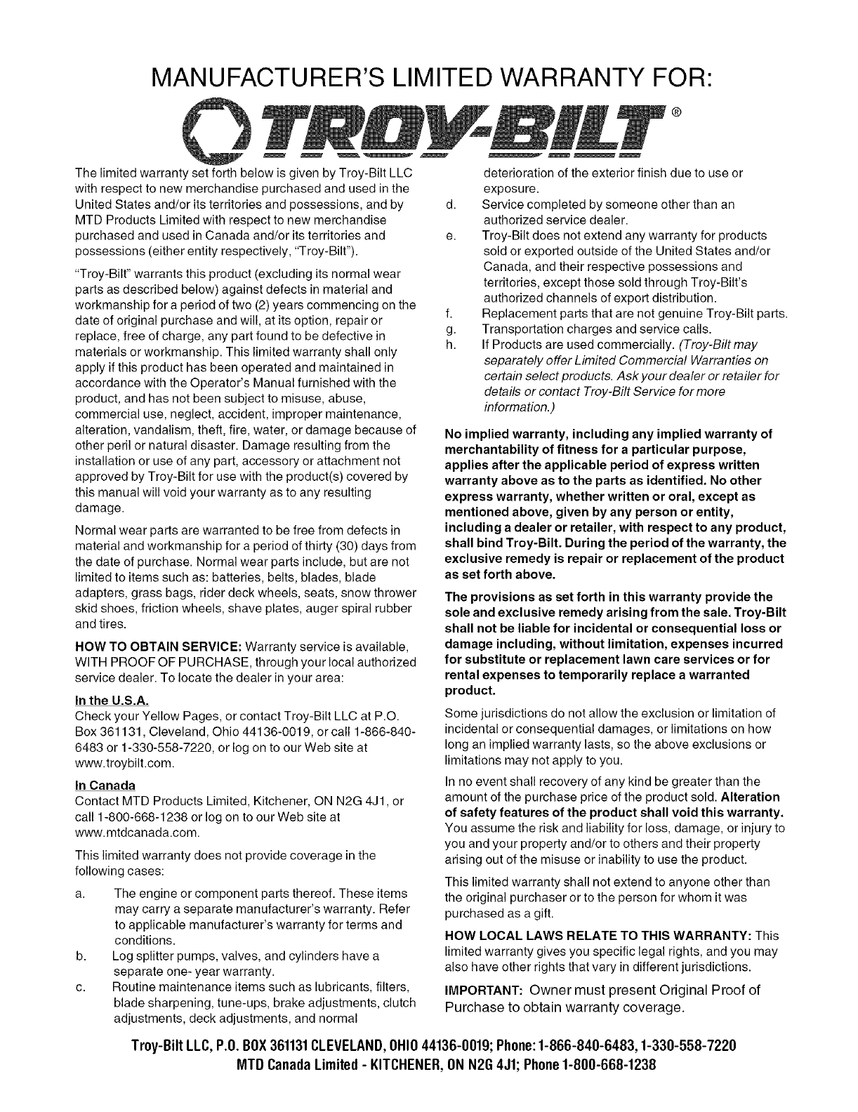Troy-Bilt LLC, P.O.BOX361131CLEVELAND,OHIO44136-0019; Phone:1-866-840-6483,1-330-558-7220