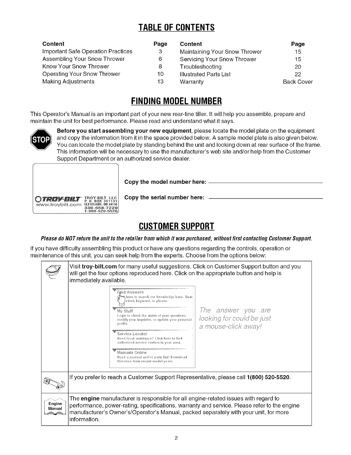 Visit troy-bilt.com for many useful suggestions. Click on Customer Support button and you
