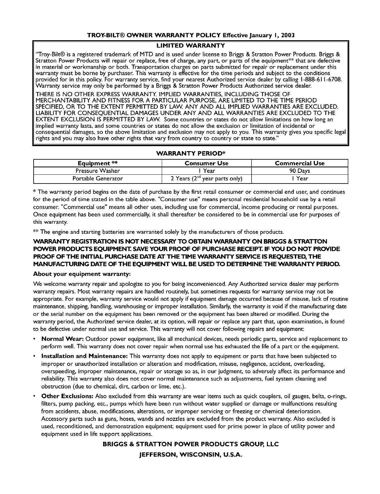 TROY-BILT® OWNER WARRANTY POLICY Effective January I, 2003