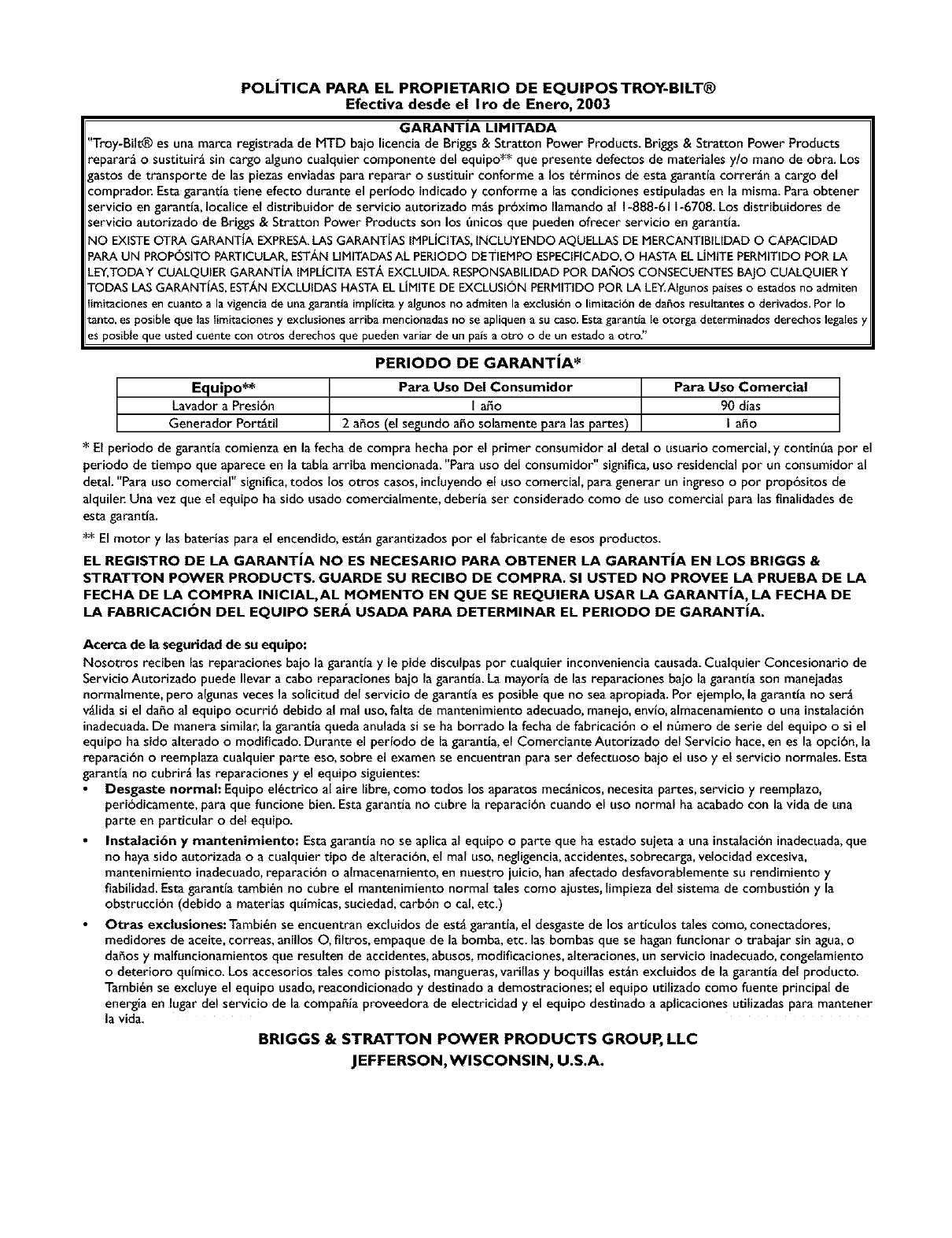 servido autorizado de Briggs & Stratton Power Products son los _nicos que pueden ofrecer servicio en garantfa.