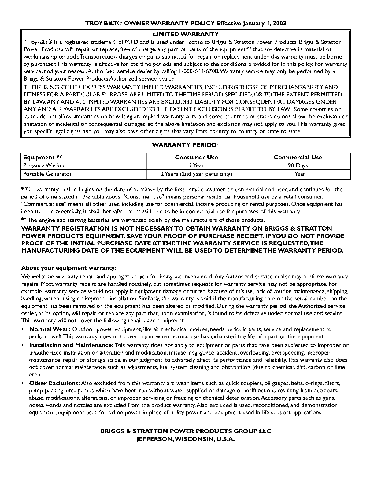 TROY-BILT®OWNER WARRANTY POLICY Effective January I, 2003