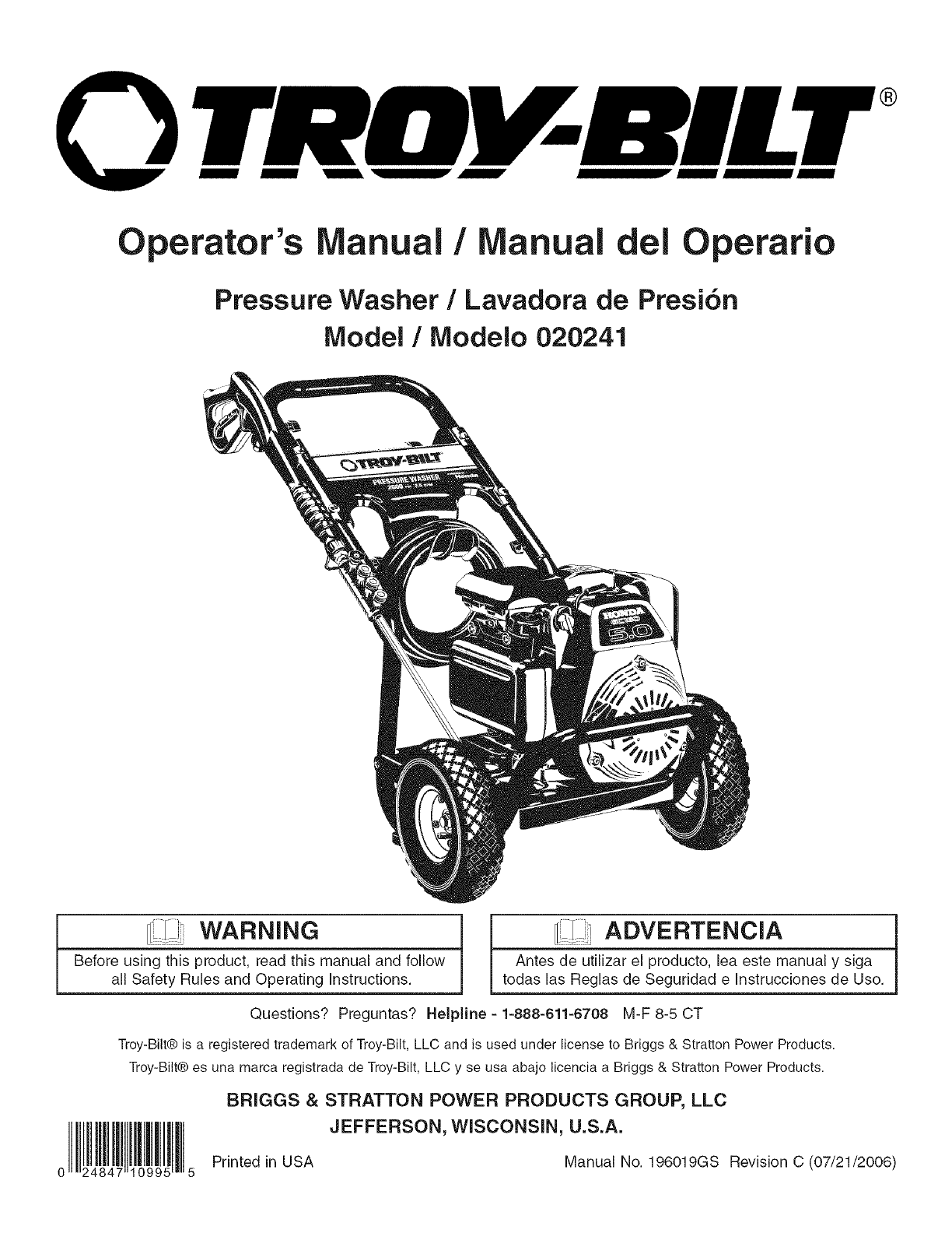 User Manual: Troybilt 020241 020241 TROYBILT PRESSURE WASHER - Manuals and Guides View the owners manual for your TROYBILT PRESSURE WASHER #020241. Home:Lawn & Garden Parts:Troybilt Parts:Troybilt PRESSURE WASHER Manual