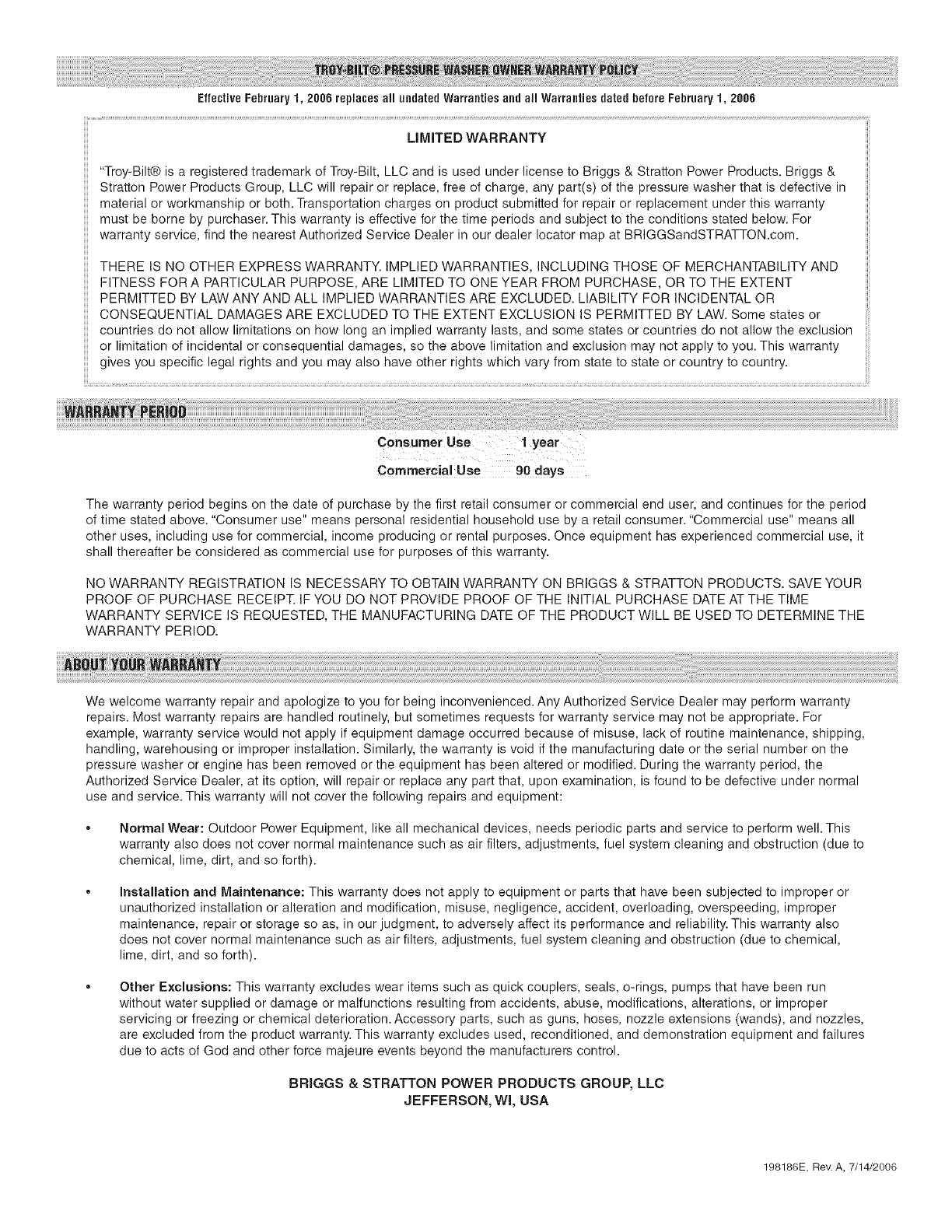 Troybilt 020241 User Manual PRESSURE WASHER Manuals And Guides L0607508