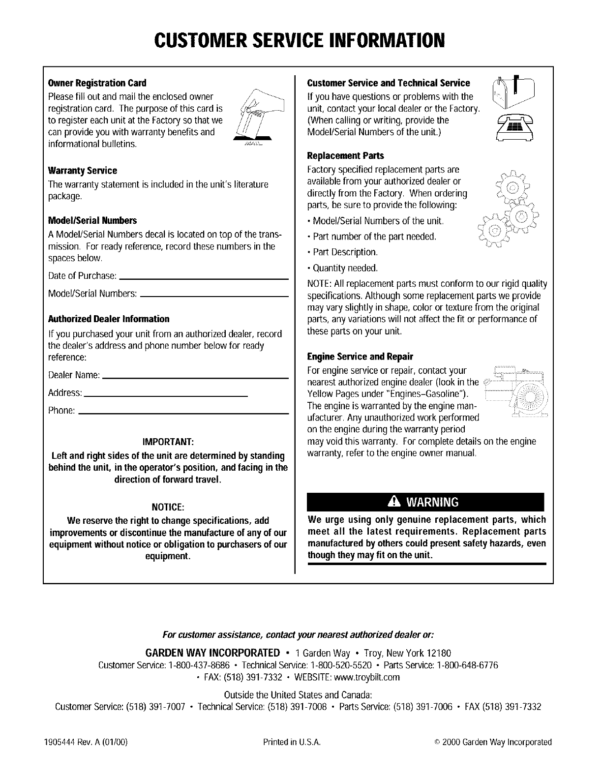 1905444 Rev. A (01/00) Printed in U,S.A. o 2000 Garden Way Incorporated