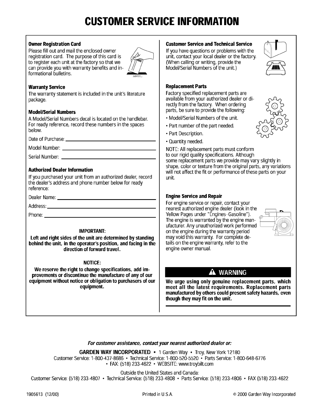 1905613 (12/00) Printed in U,S,A, © 2000 Garden Way Incorporated