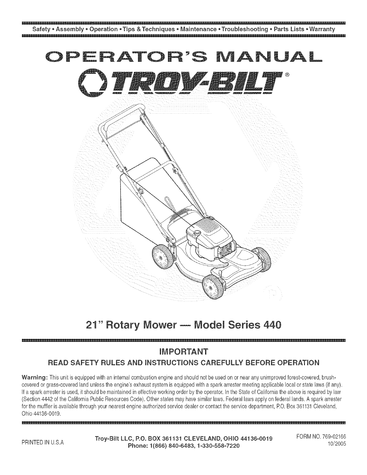 PRINTEDiN U,S,A Troy-Bilt LLC, P.O. BOX 381131 CLEVELAND, OHIO 44138-0019 FORMNO,769=02166
