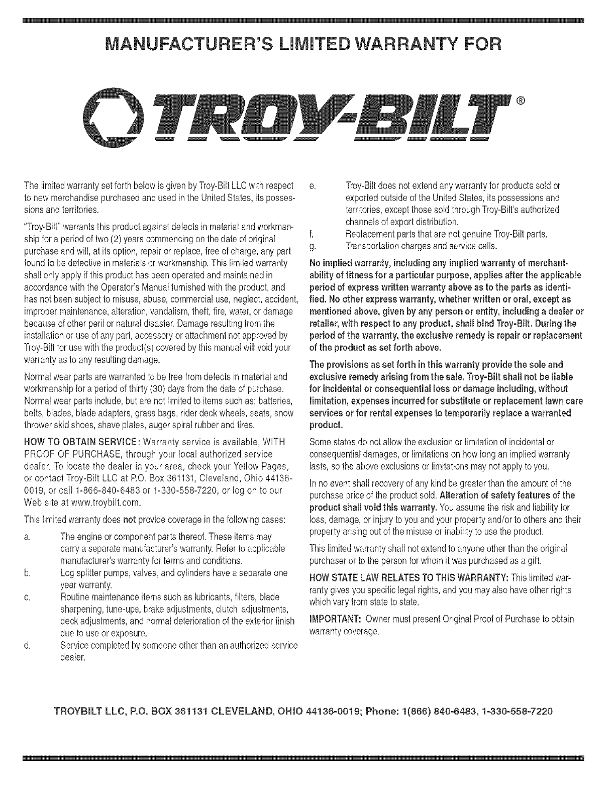 or contact Troy-Bilt LLC at RO. Box 361131,Cleveland, Ohio 44136-