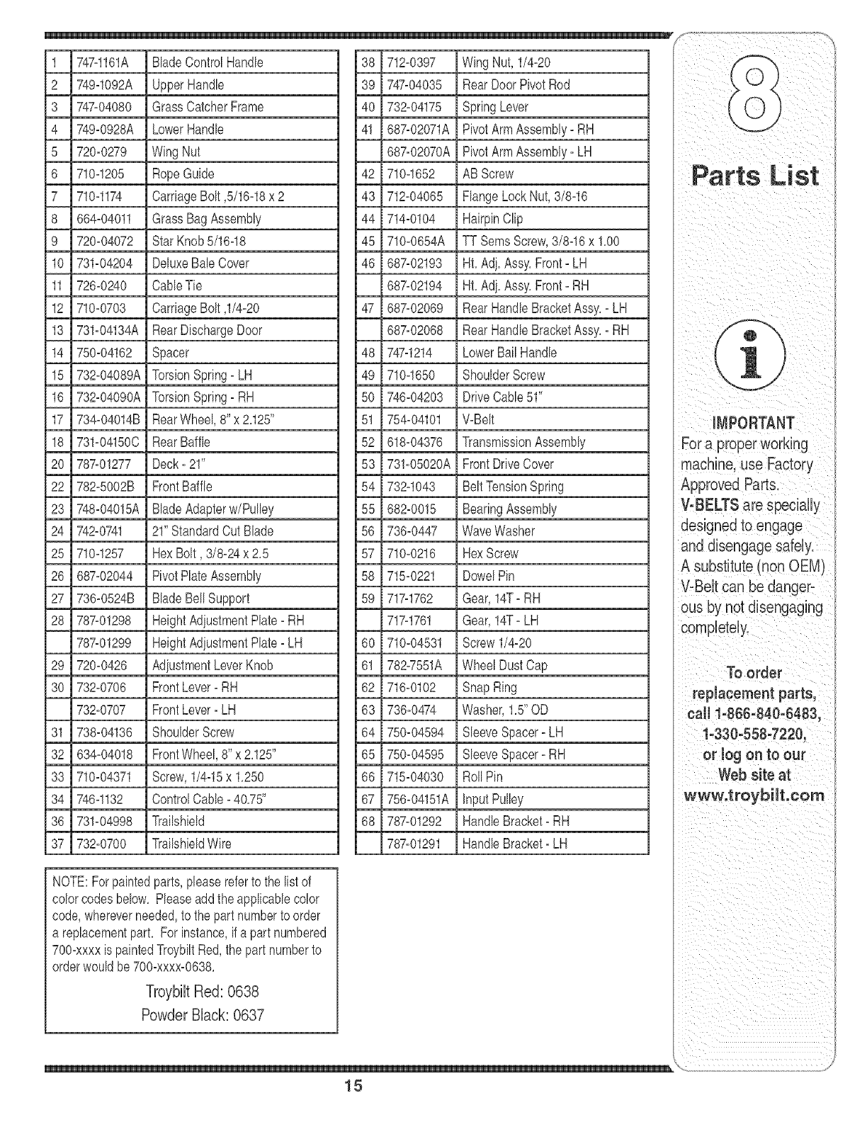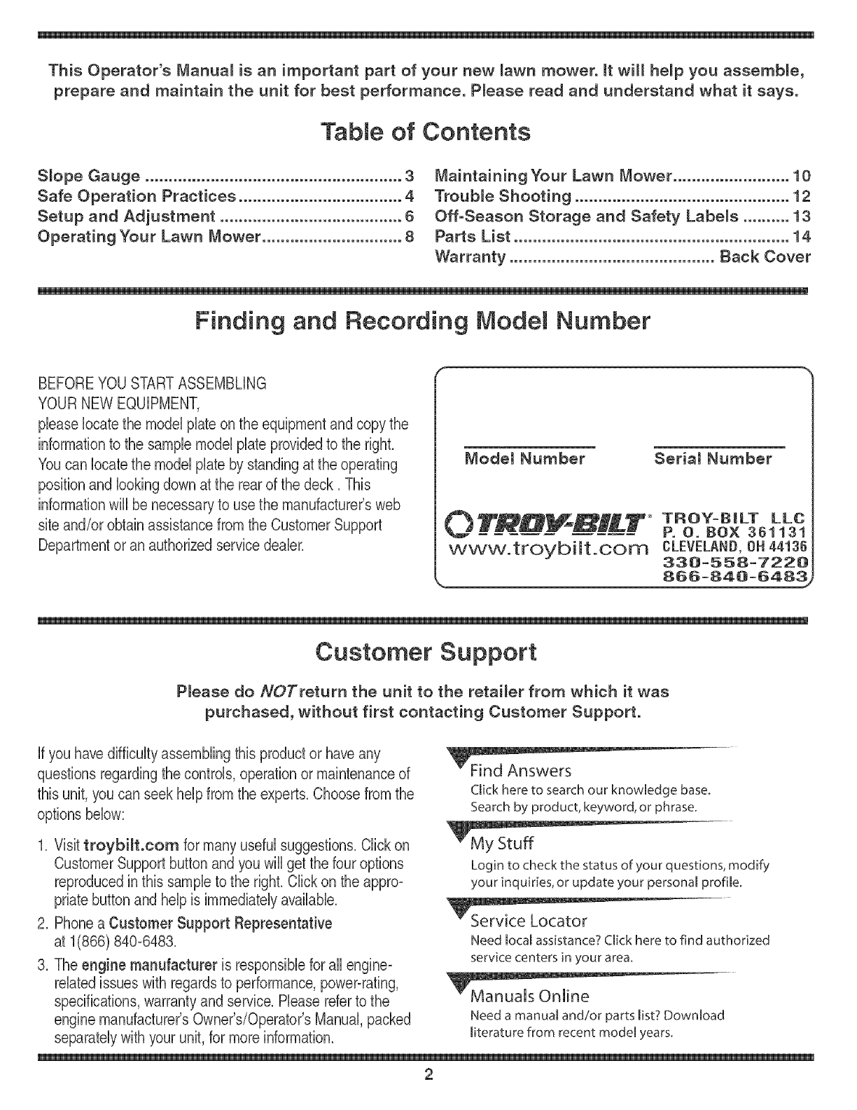 TROYBILT LLC, P.O. BOX 361131 CLEVELAN D, OHIO 44136-0019; Phone: 1(866} 840-6483, 1-330-558-7220