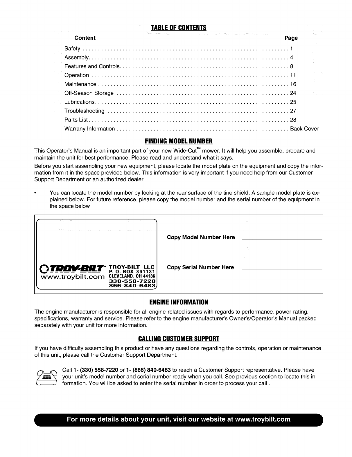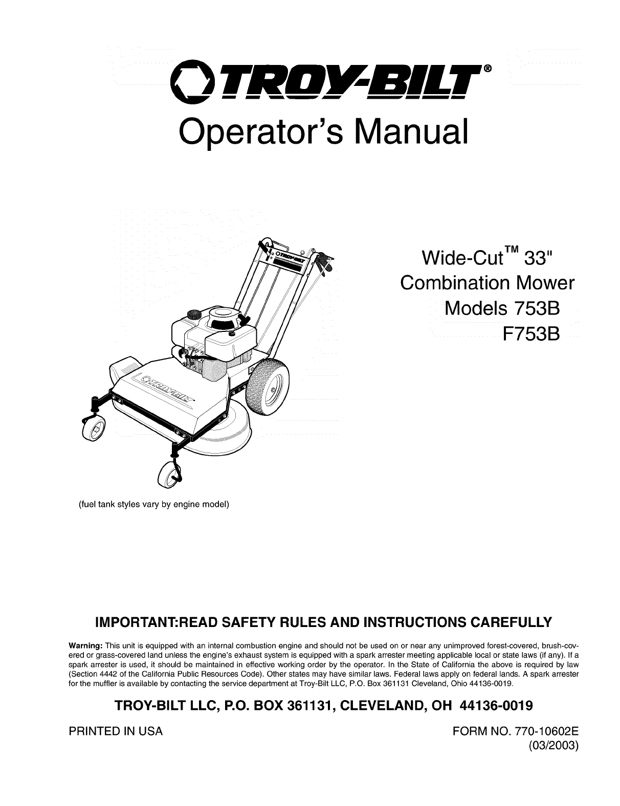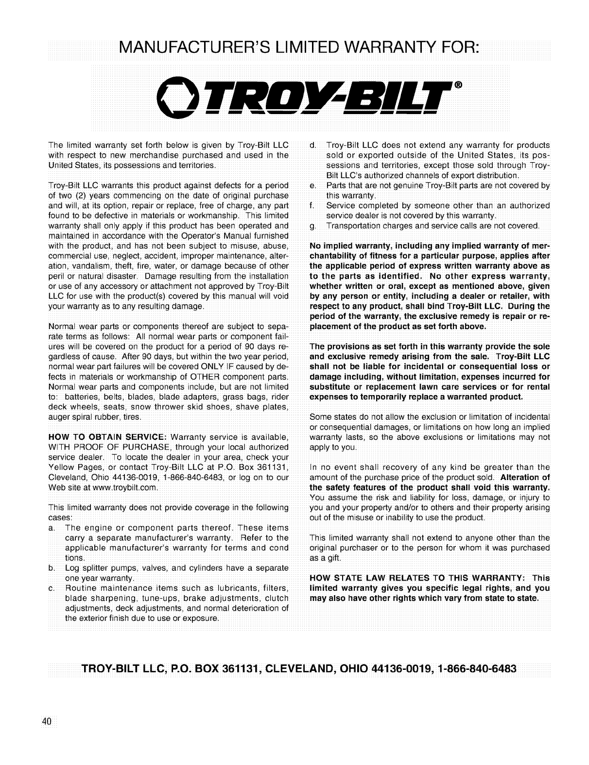 TROY_BILT LLCi P.Oi BOX 361131i CLEVELAND iOHIO 44136.0019i 1.866.840.6483