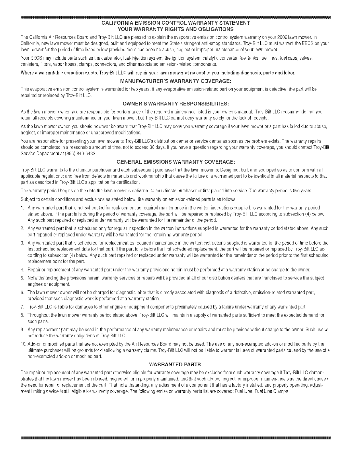 8. Throughoutthe lawnmowerwarrantyperiodstated above,Troy-BiltLLCwillmaintaina supplyof warrantedparts sufficientto meet the expecteddemandfor