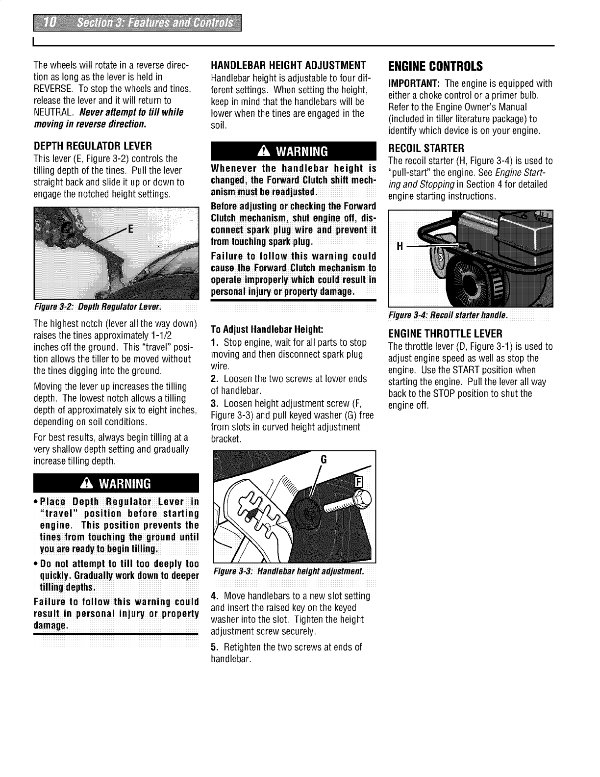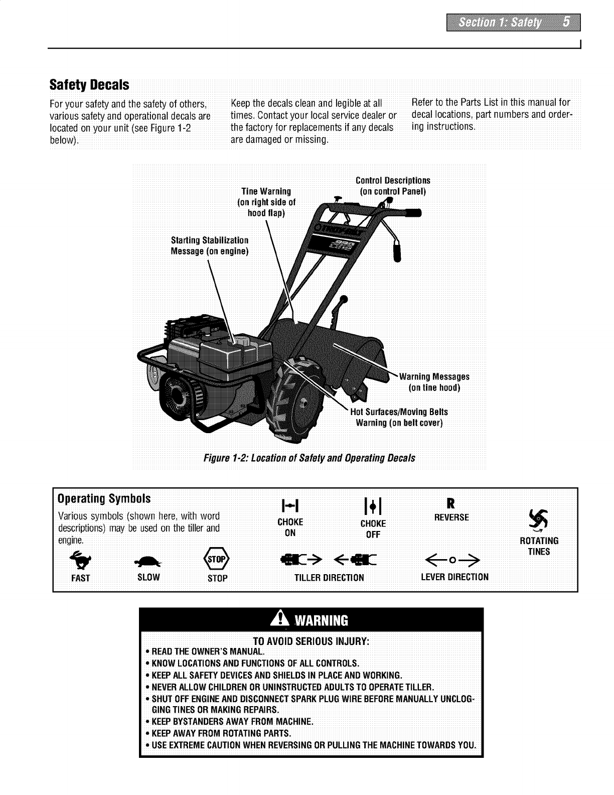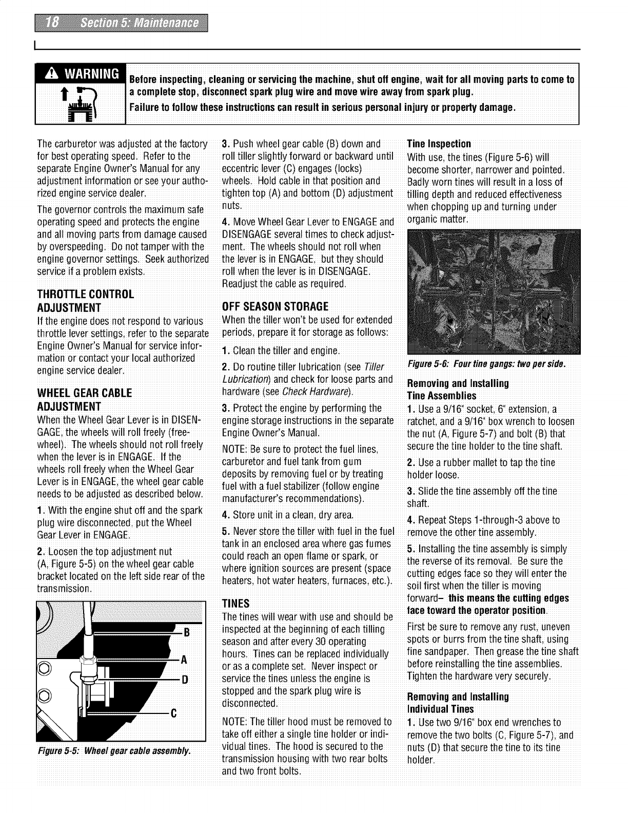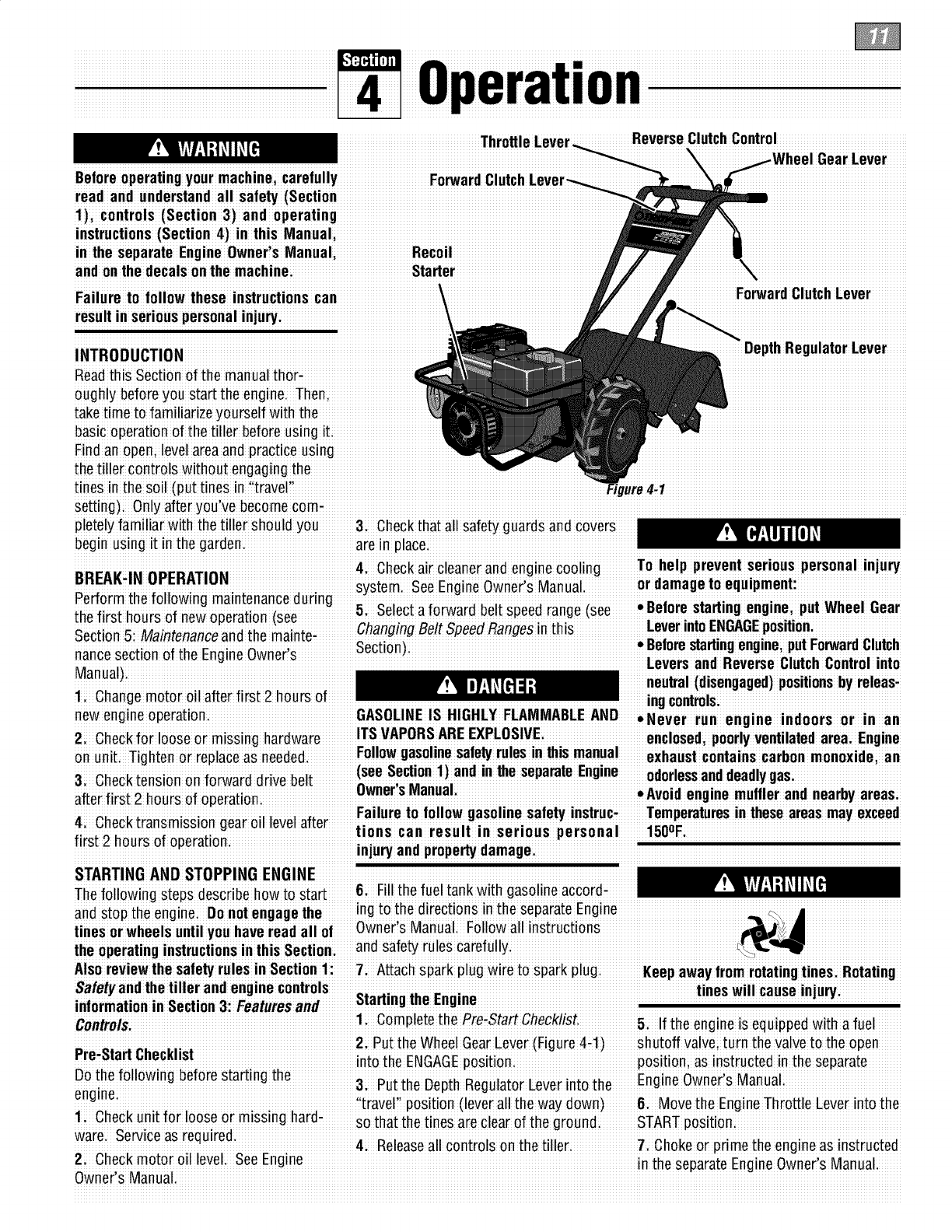 proper use of the tiller andits engine: footwear.Wear protectivefootwear that will l, lf fuel is spilledi donor attempt to