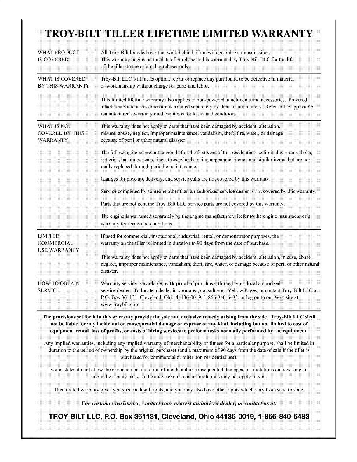 TROY-BILT TILLER LIFETIME LIMITED WARRANTY