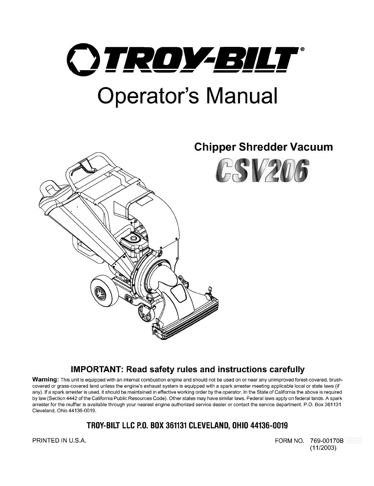 This Operator's Manual is an important part of your new chipper shredder vacuum. It will help you