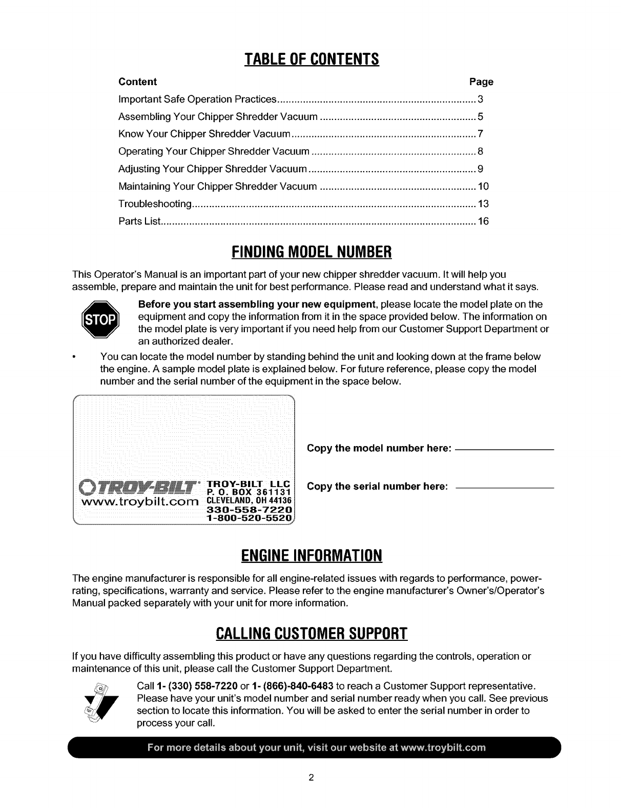 Troy-Bilt LLC,P.O.BOX361131CLEVELAND,OHIO44136-0019; Phone:1-866-840-6483,1-330-558-7220