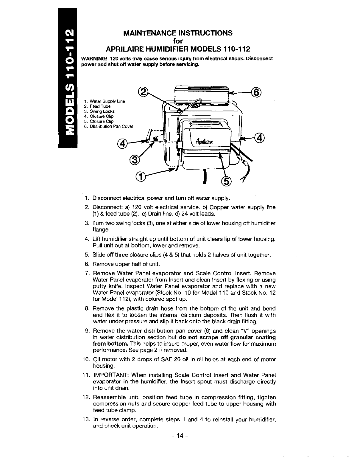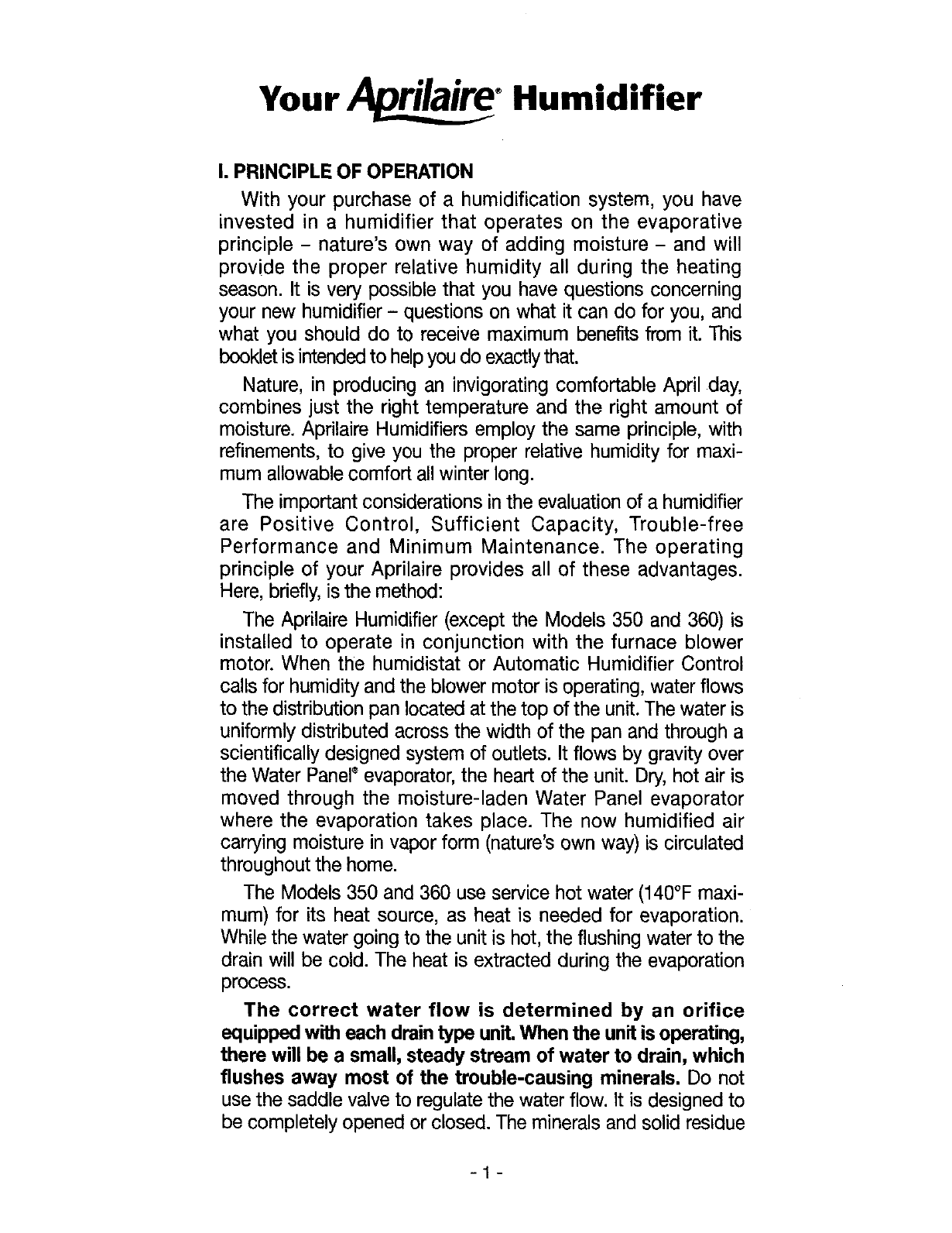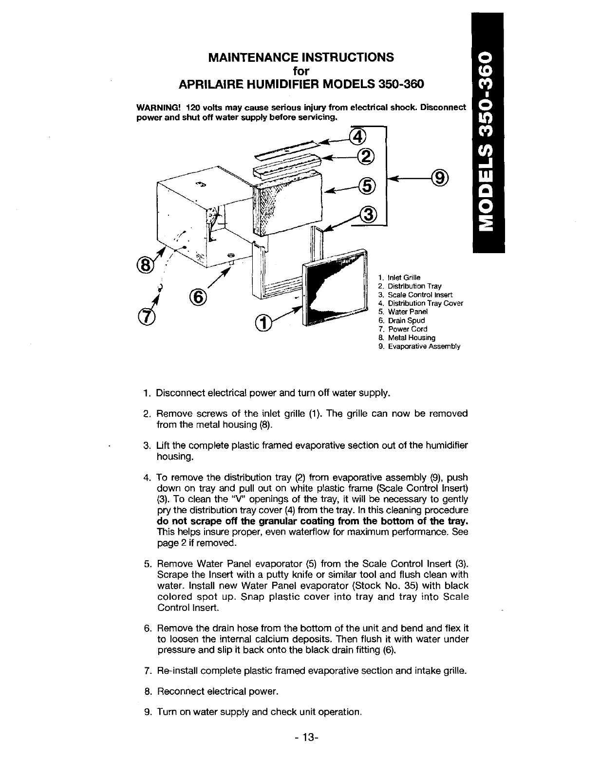 The Aprilaire Humidifier (except the Models 350 and 360) is