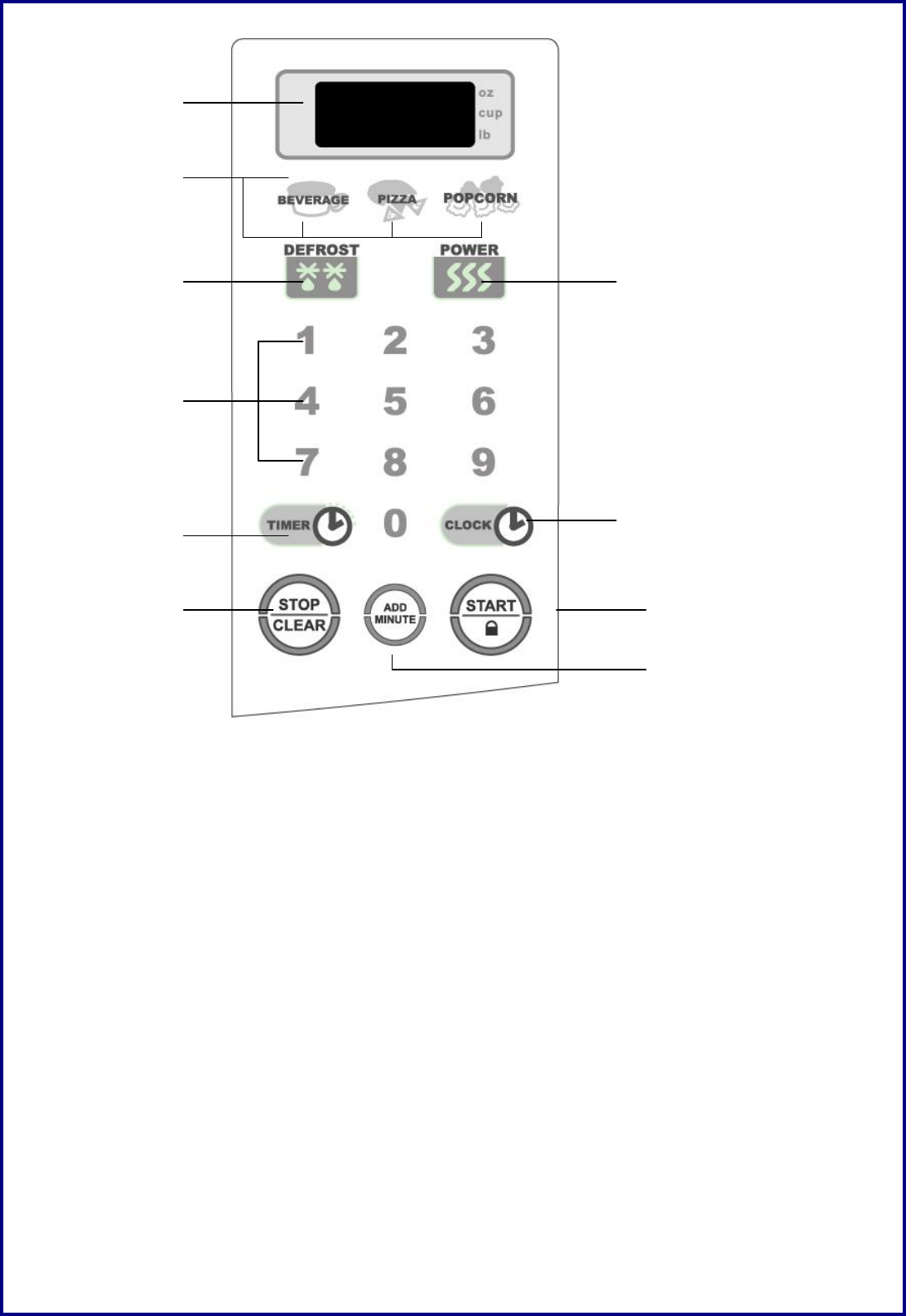 9. START—Allows you to “Start” all entries (except the popcorn, beverage, pizza, defrost