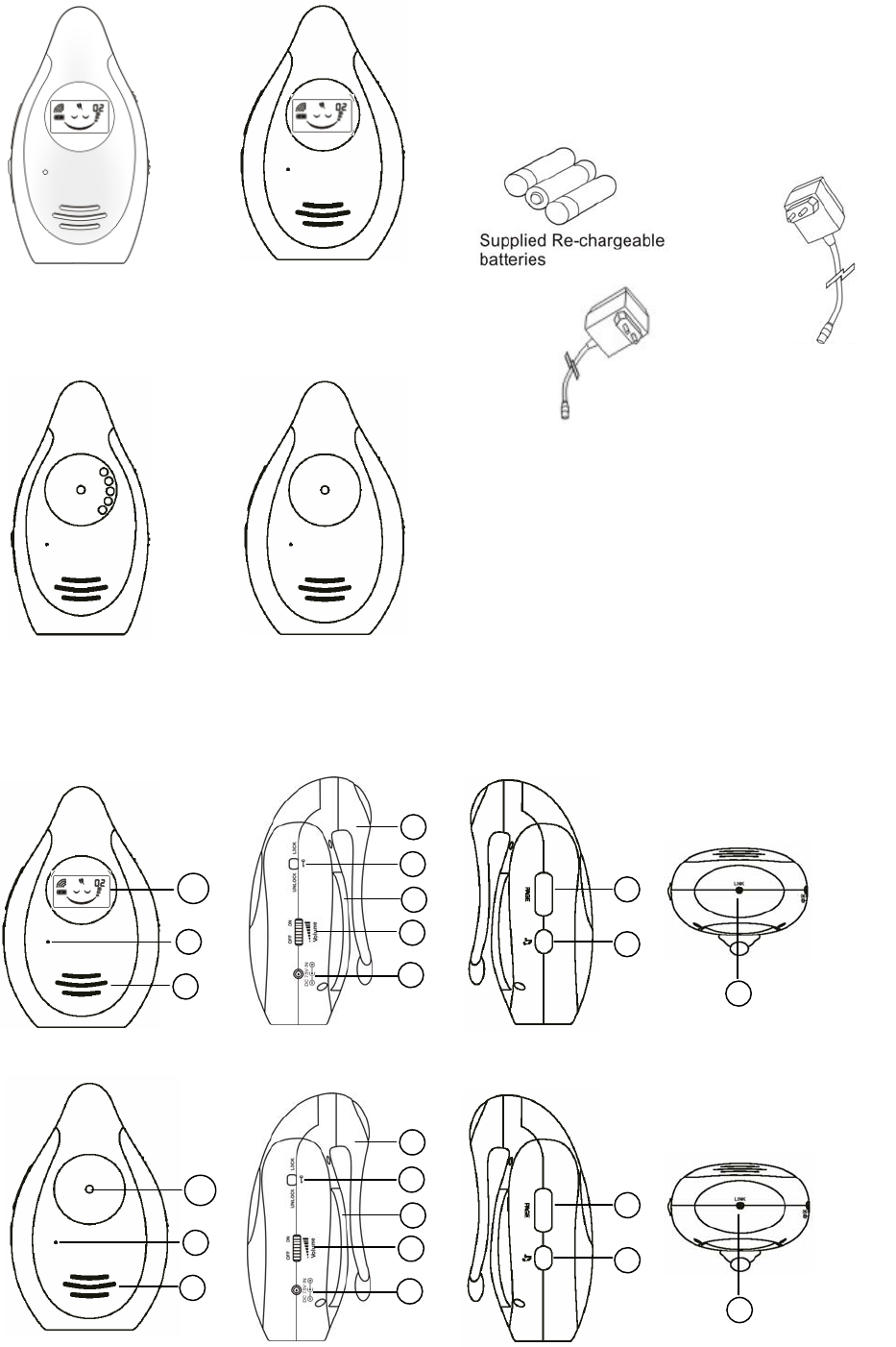 Parents unit : 3 AAA batteries or rechargeable batteries &