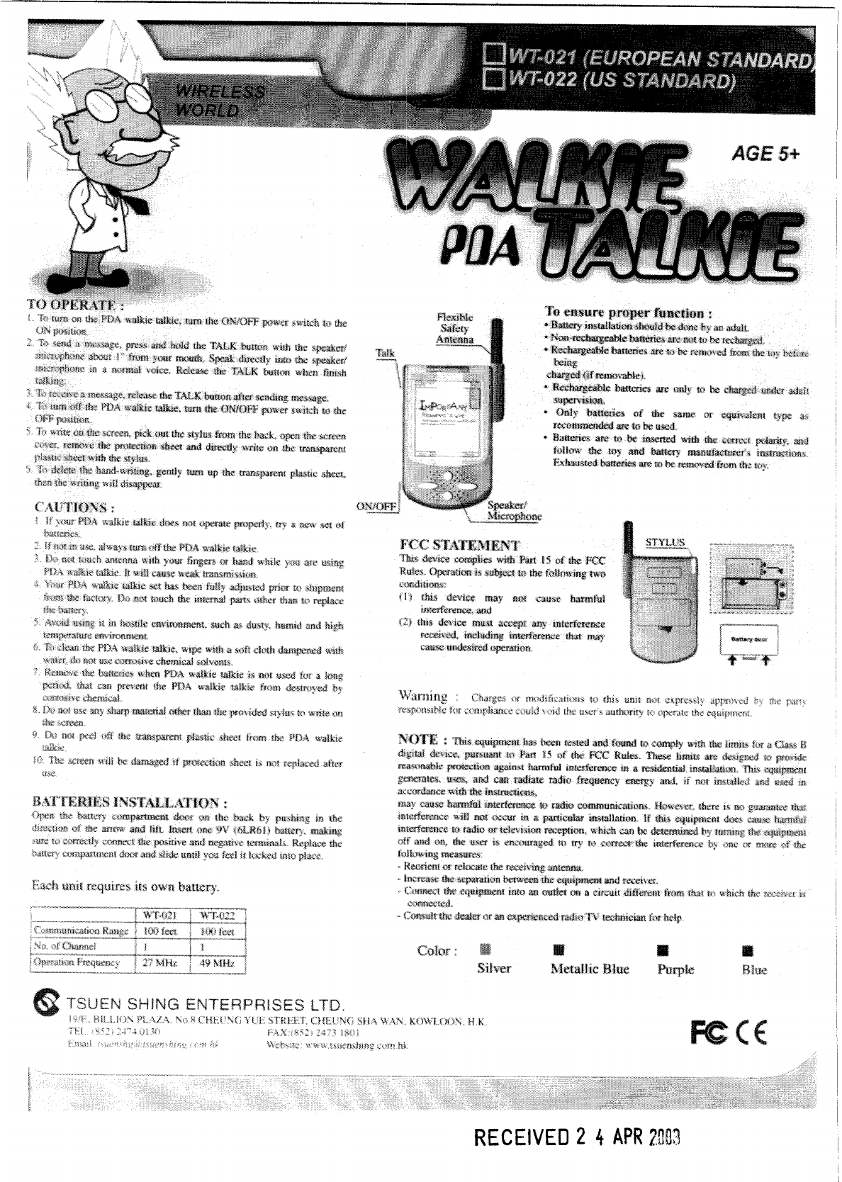 Tsuen Shing WT022 PDA Walkie Talkie User Manual