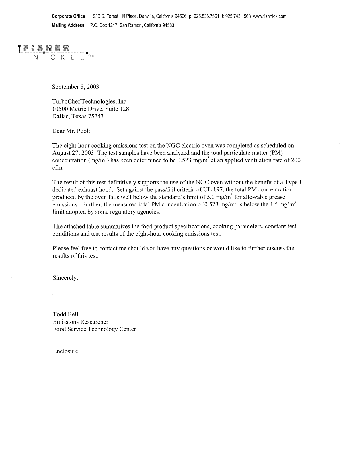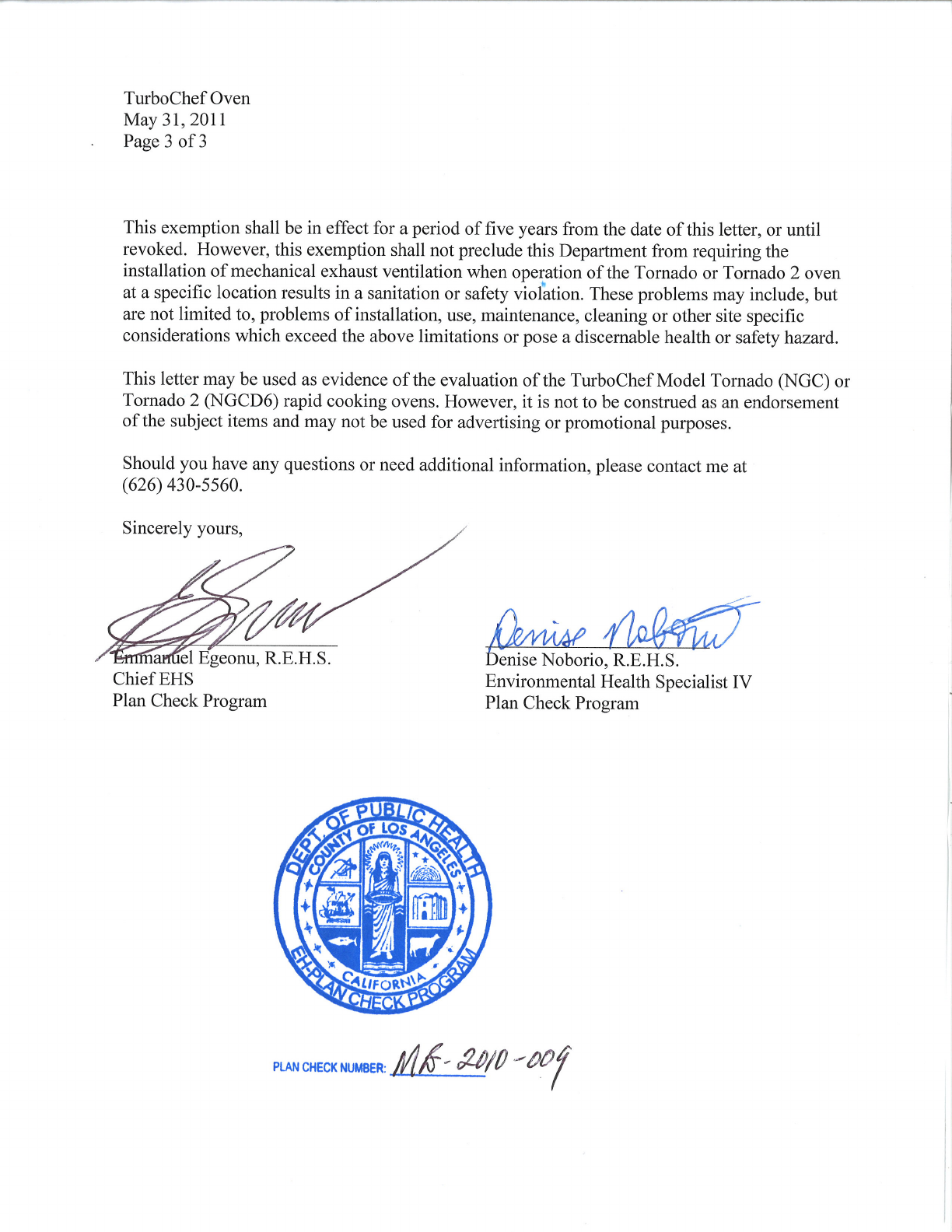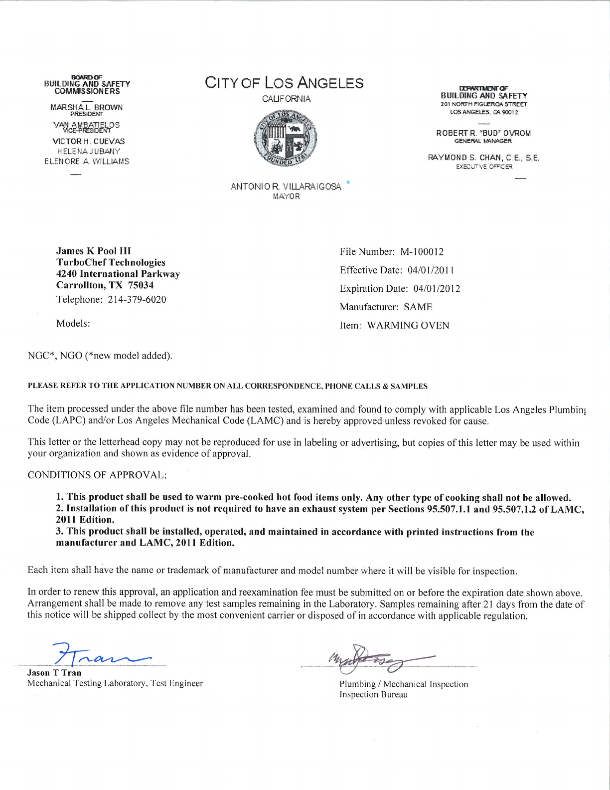 This letter may be used as evidence of the evaluation of the TurboChef Model Tomado (NGC) or