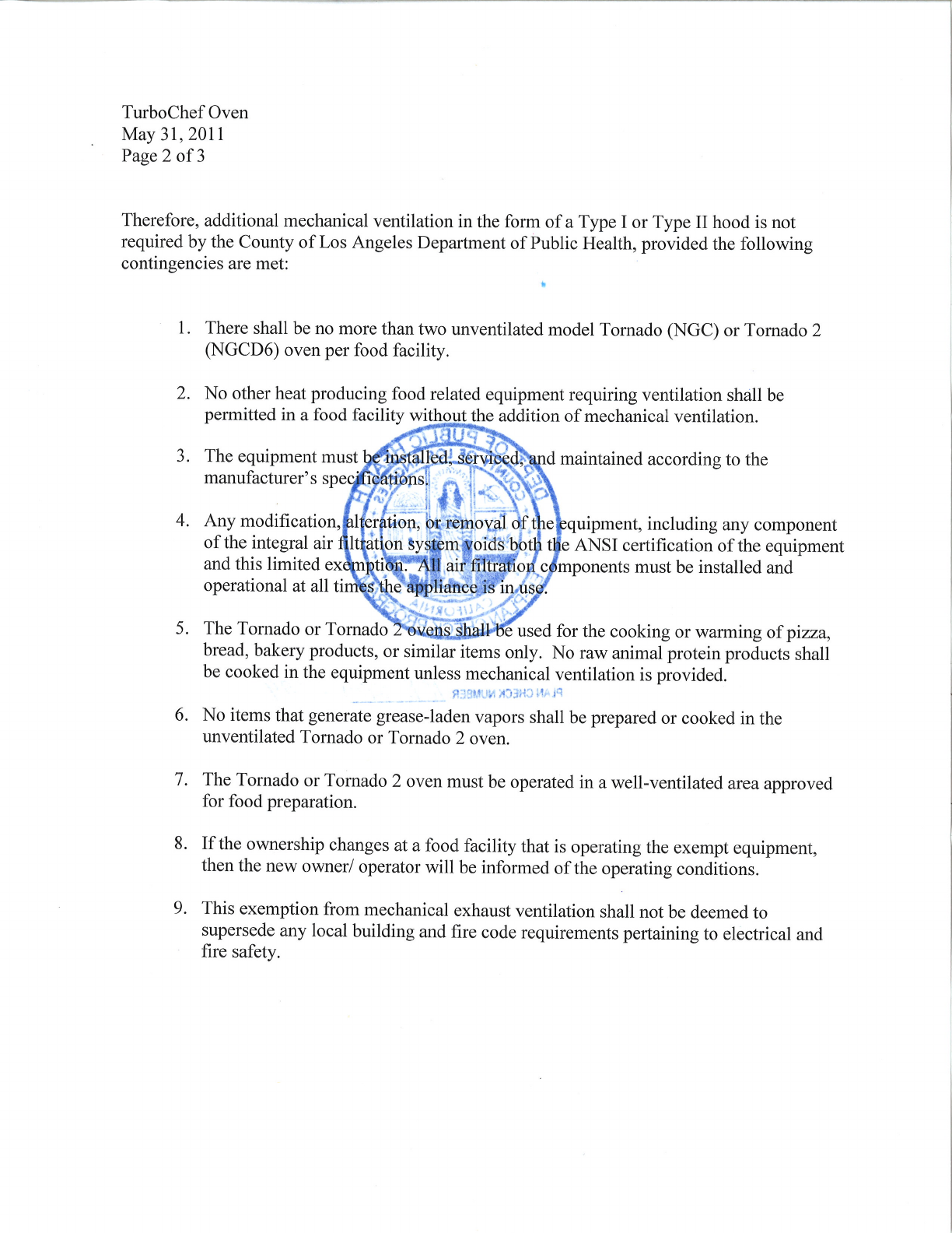 installation of mechanical exhaust ventilation when operation of the Tomado or Tornado 2 oven