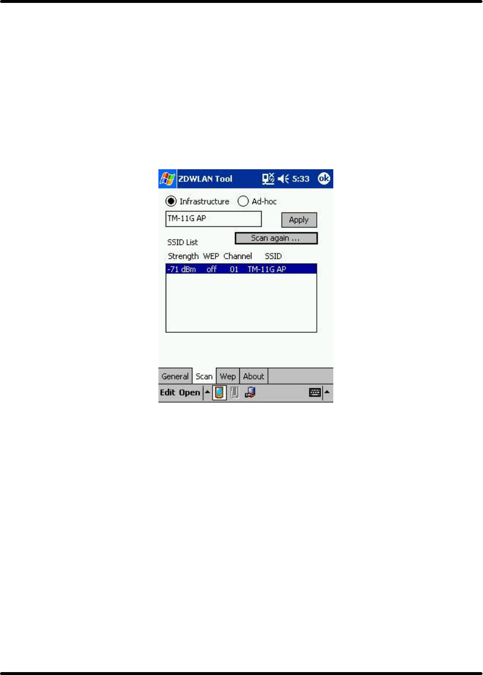 Click the Apply button to show selected SSID on left blank and network type (Infrastructure/Ad-hoc).