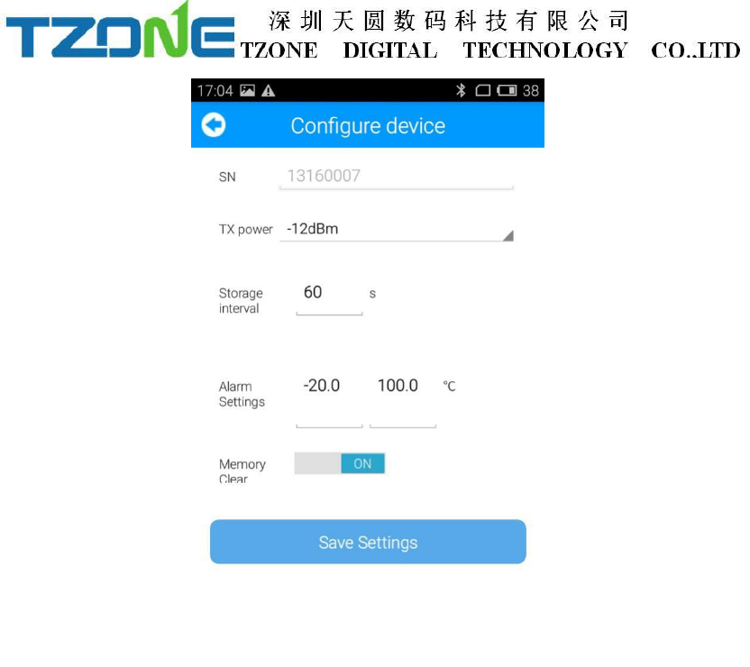 transmit power can be selected in the drop-down list; storage interval and alarm