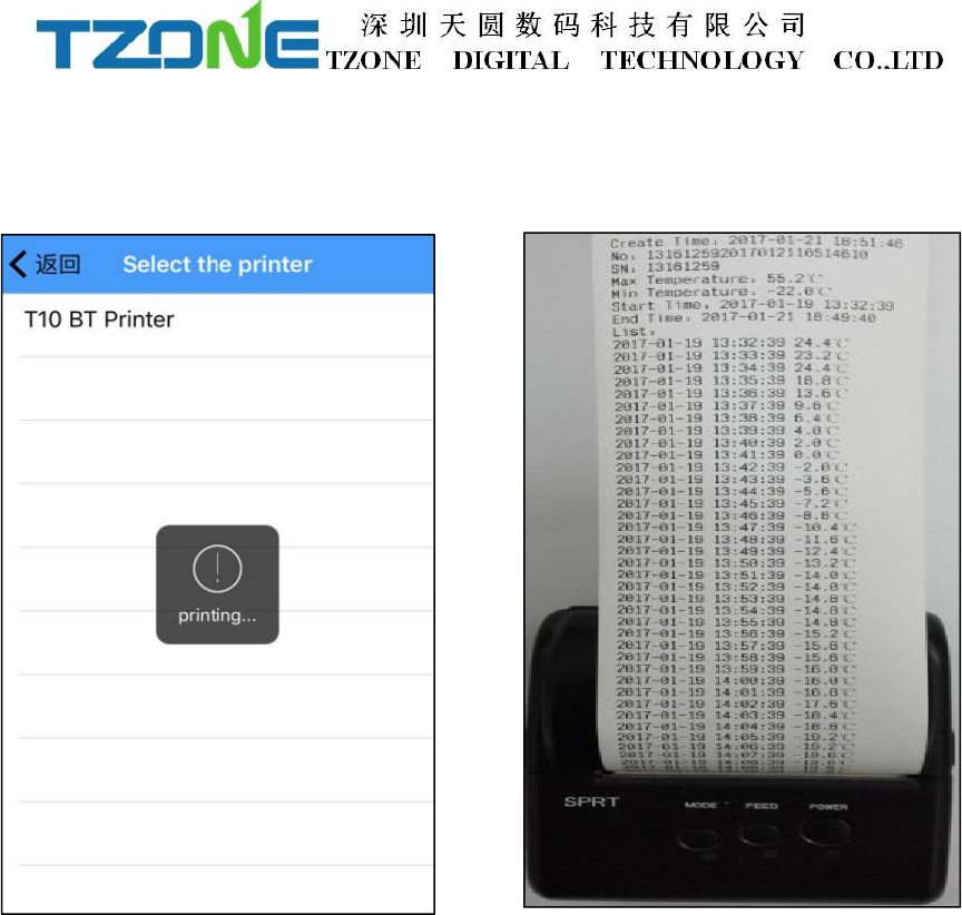 recording, start time, end time, temperature graph and Bluetooth printing, the