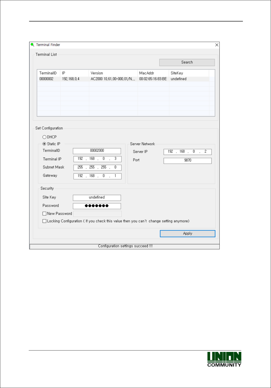 8) Click [Apply] button and ‘configuration settings success’ will be displayed at the bottom