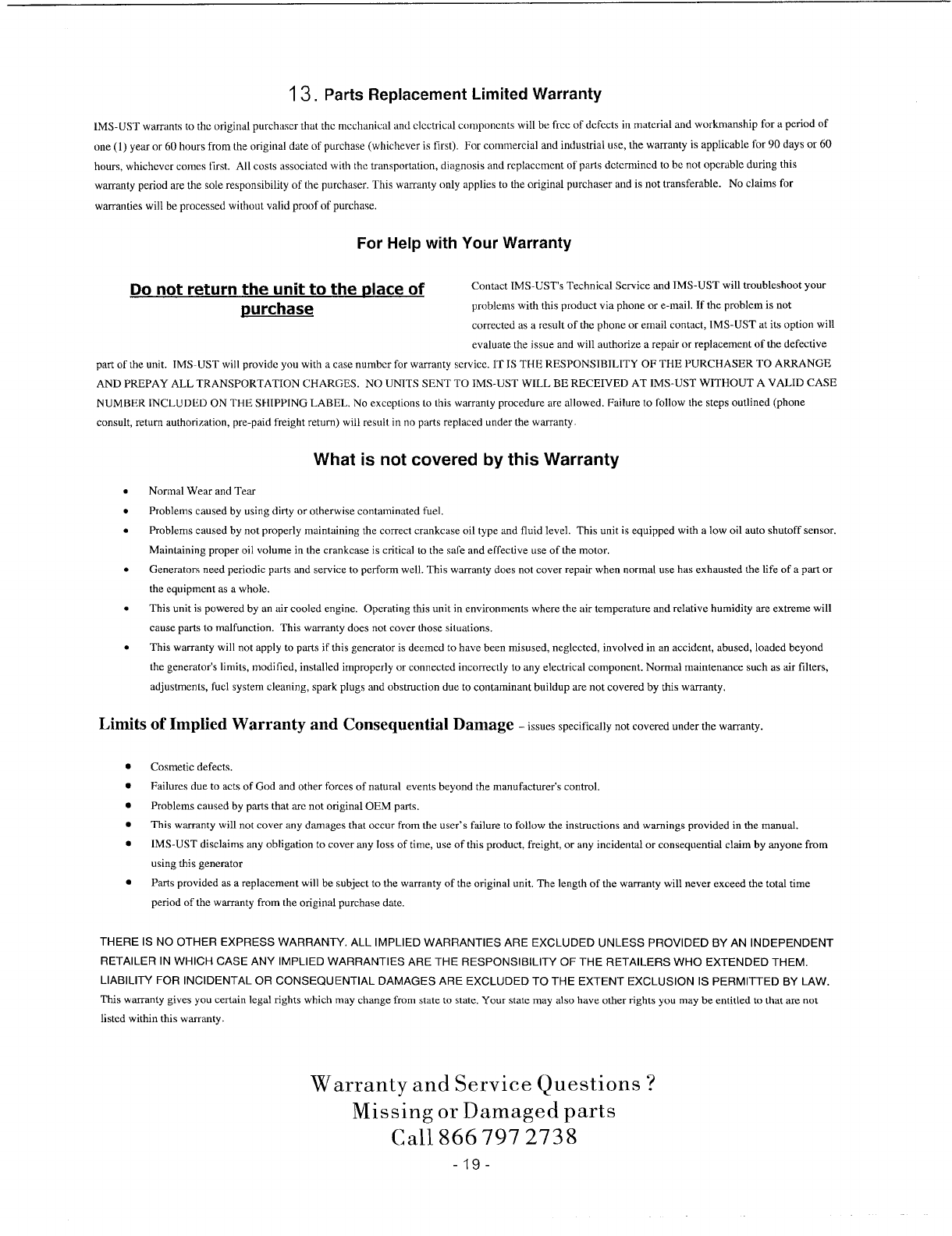 •This warranty will not apply to parts if this generator is deemed to have been misused, neglected, involved in an accident, abused, loaded beyond