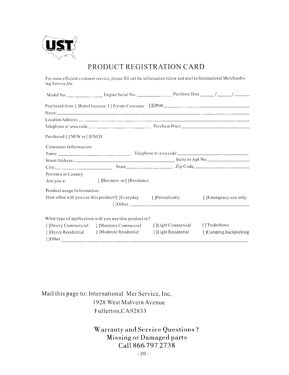 For more efficient customer service, please fill out the infolnlation below and mail to International Merchandis-
