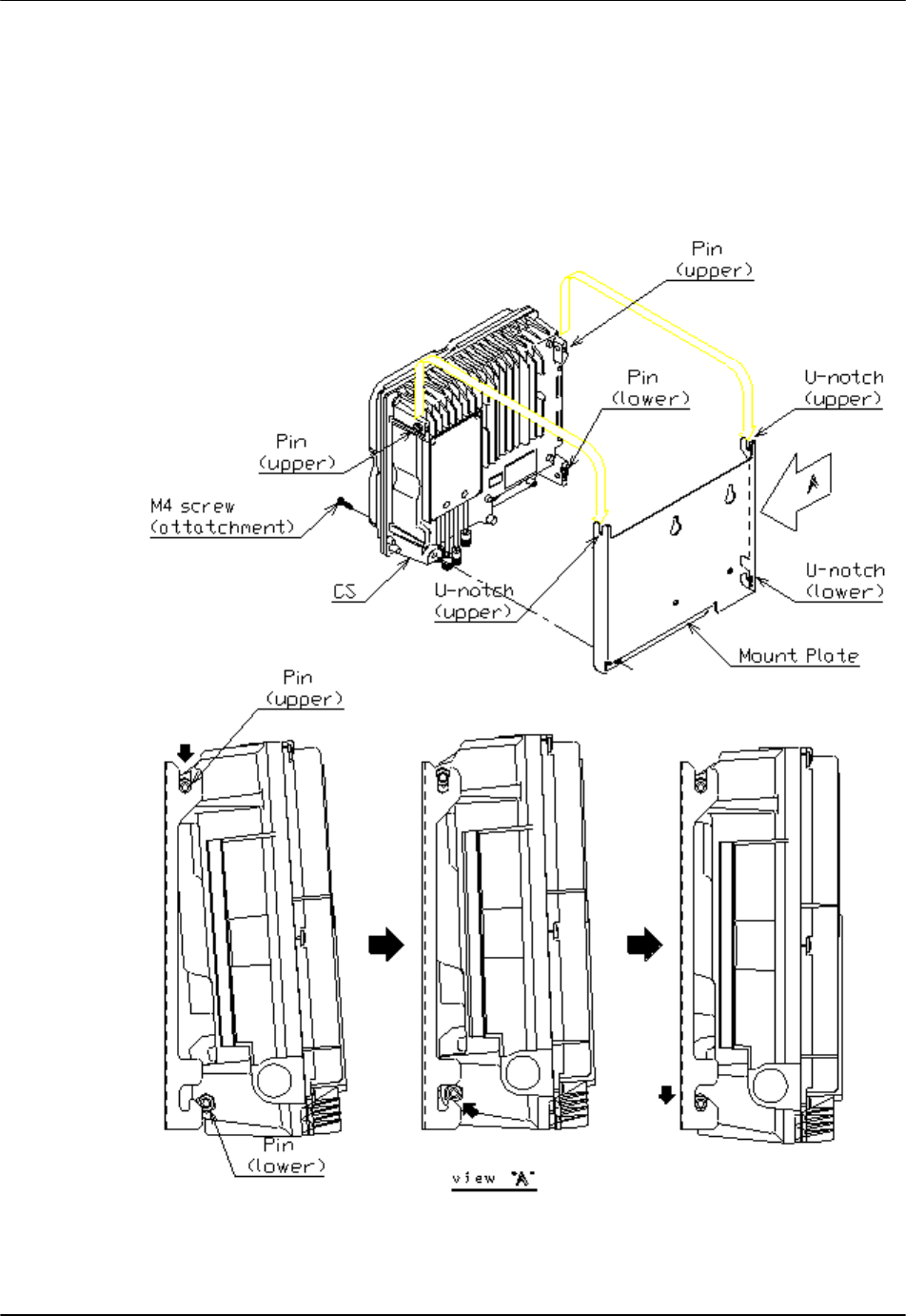 Then lift the main unit and fit the lower pins onto the lower U-notches. Finally,