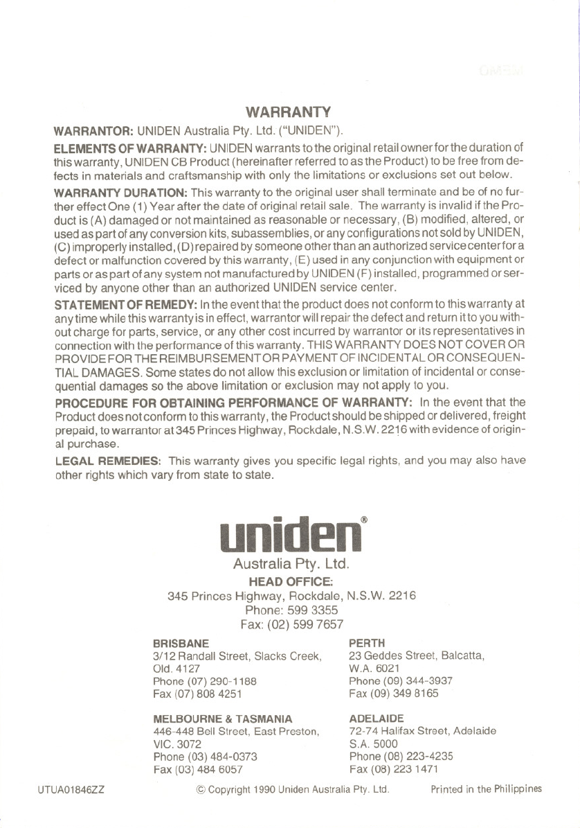 UTUA01846ZZ @ Copyright 1990 Uniden Australia Pty. Ltd. Printed in the Philippines