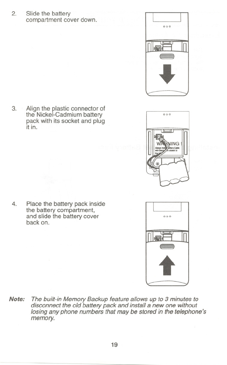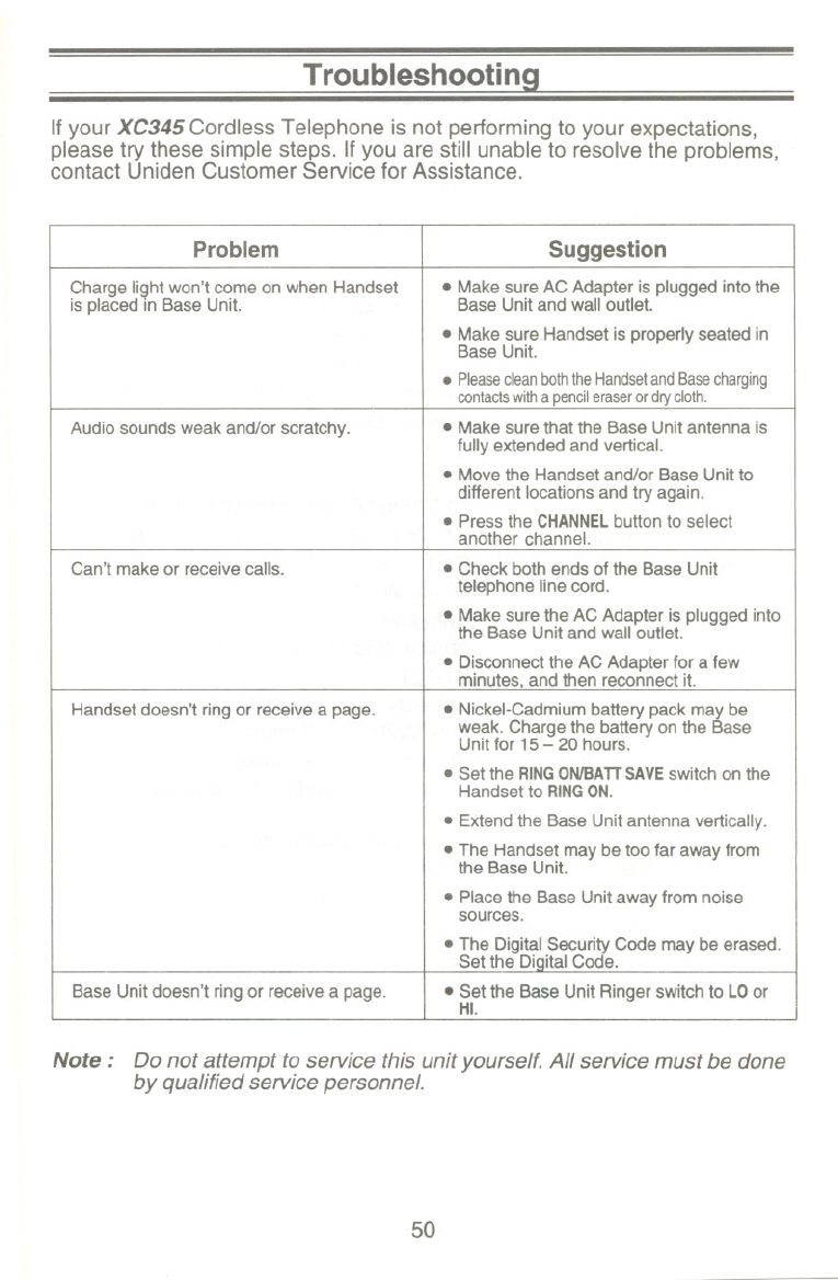 Handset doesn't ring or receive a page. .Nickel-Cadmium battery pack may be