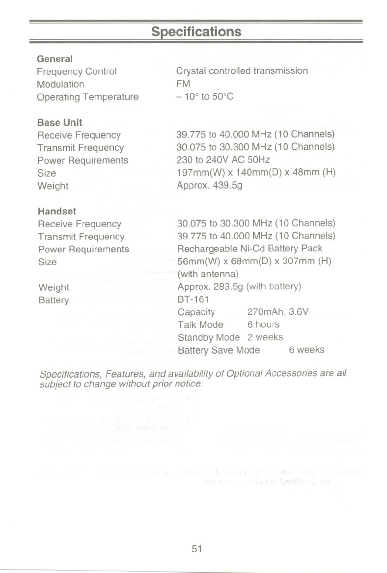 Specifications, Features, and availability of Optional Accessories are all