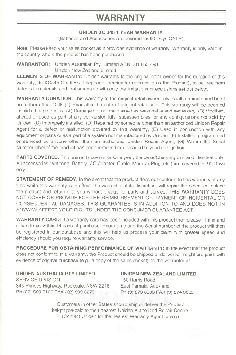 UNIDEN xc 345 1 YEAR WARRANTY
