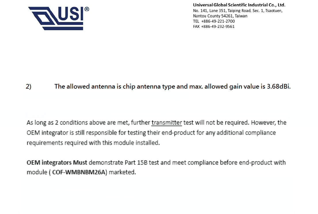 2) The Antenna for Module (COF-WMBNBM26A ) is Non-detachable and the maximum