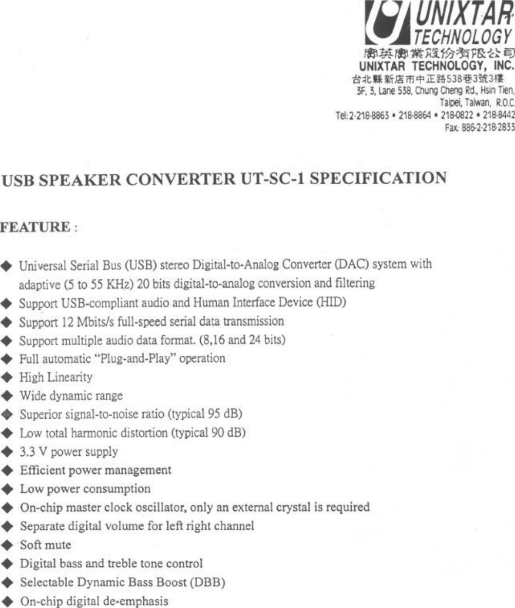 Unixtar Technology USB SPEAKER CONVERTER D PDF9810 1Spec