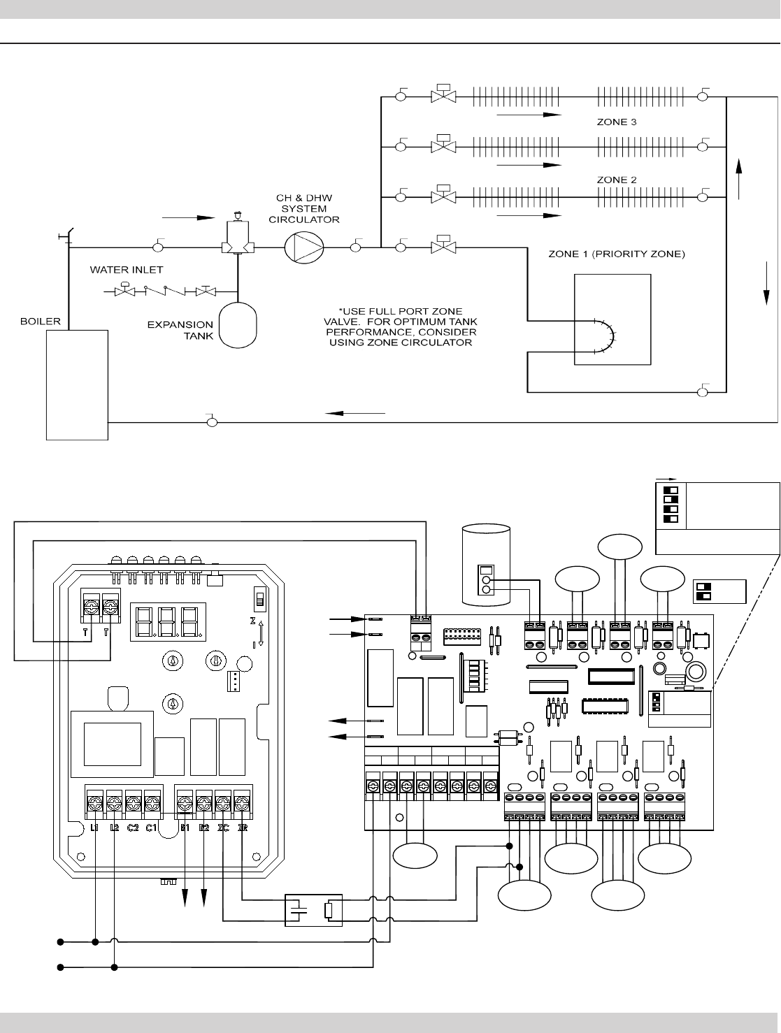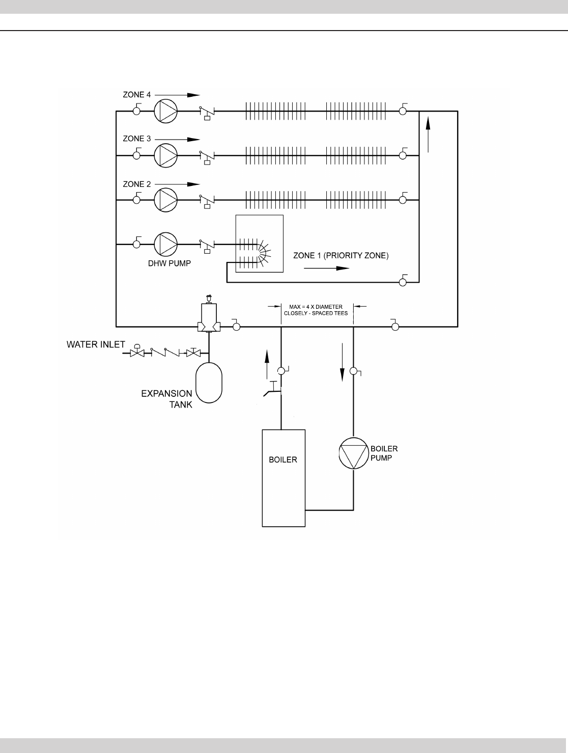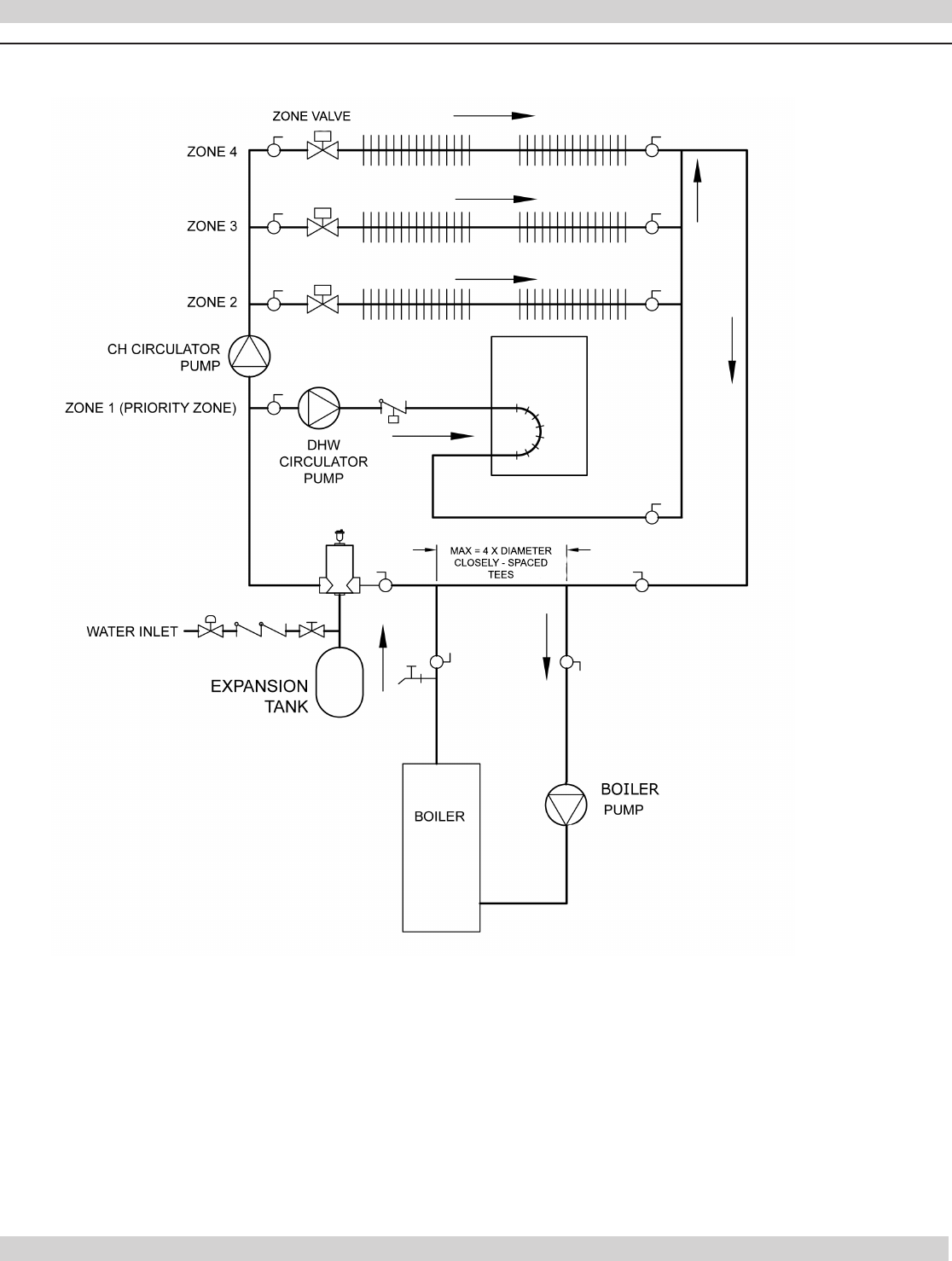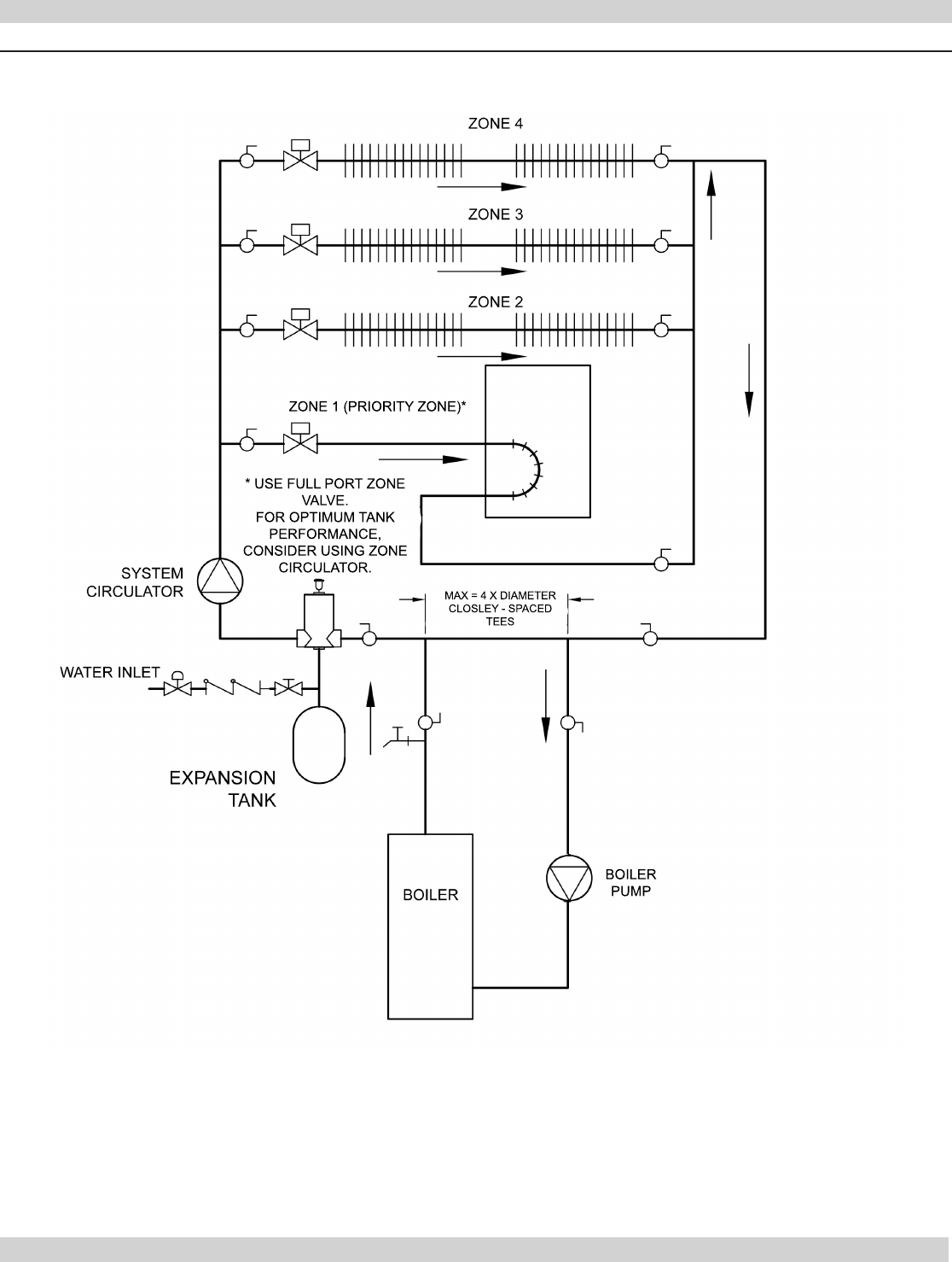 • Separate circulator or zone valve is required for each