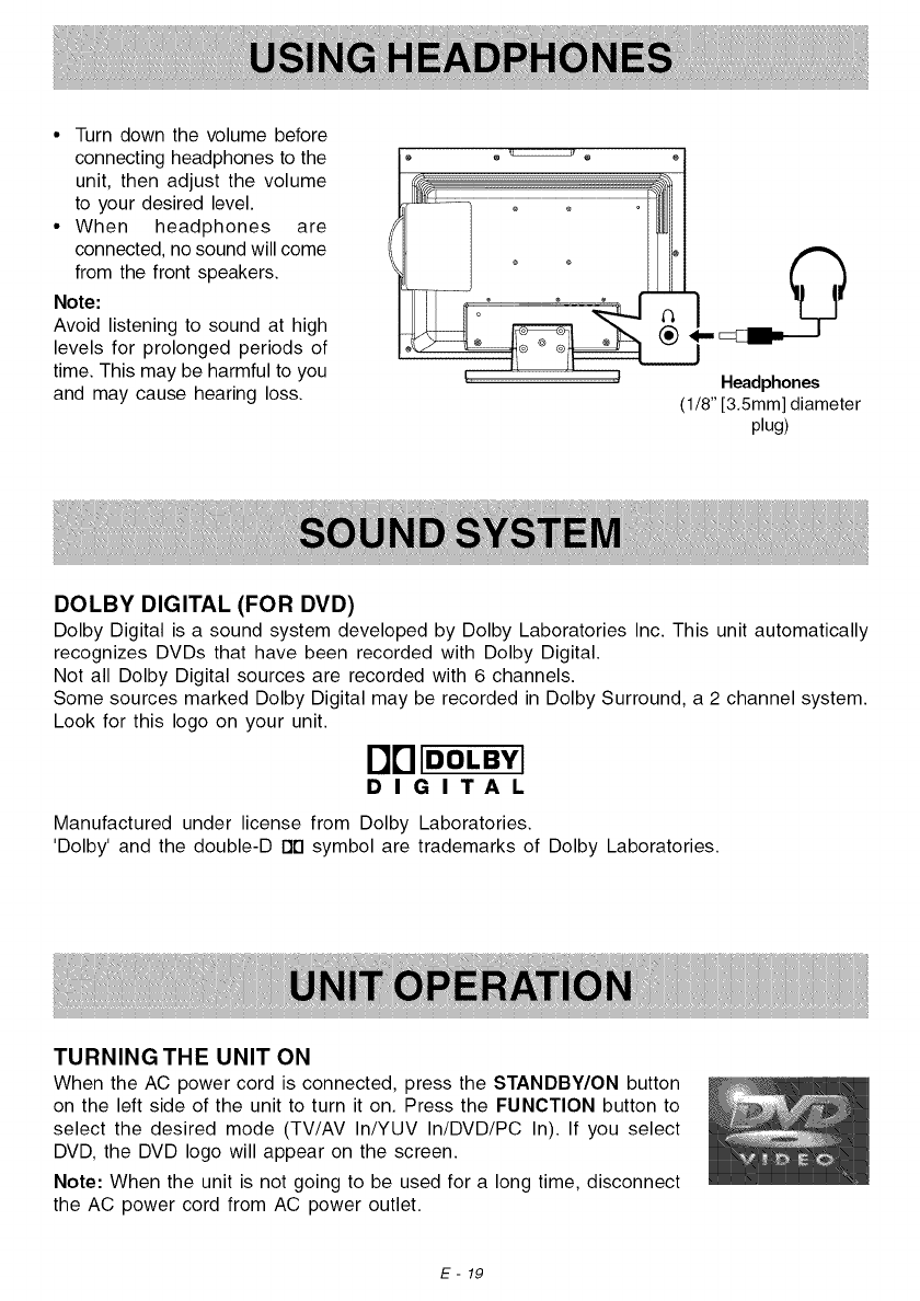 No picture or sound. • Make sure the unit is plugged in and turned on.