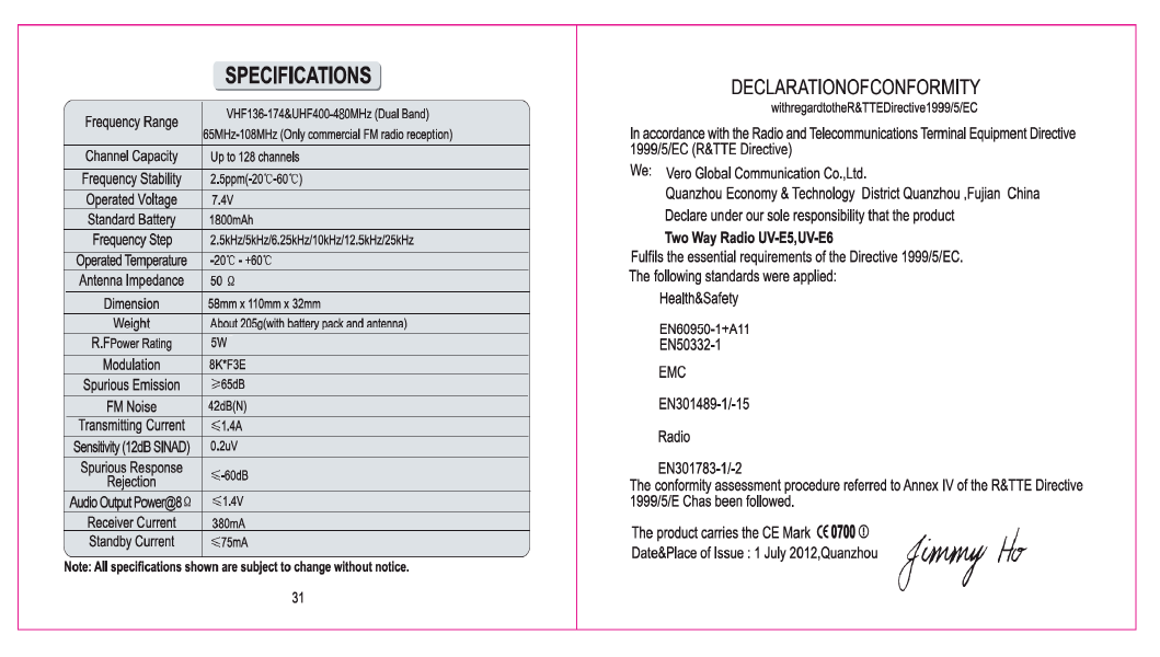 VERO GLOBAL COMMUNICATION CO.,LTD Two Way Radio UV E5 1