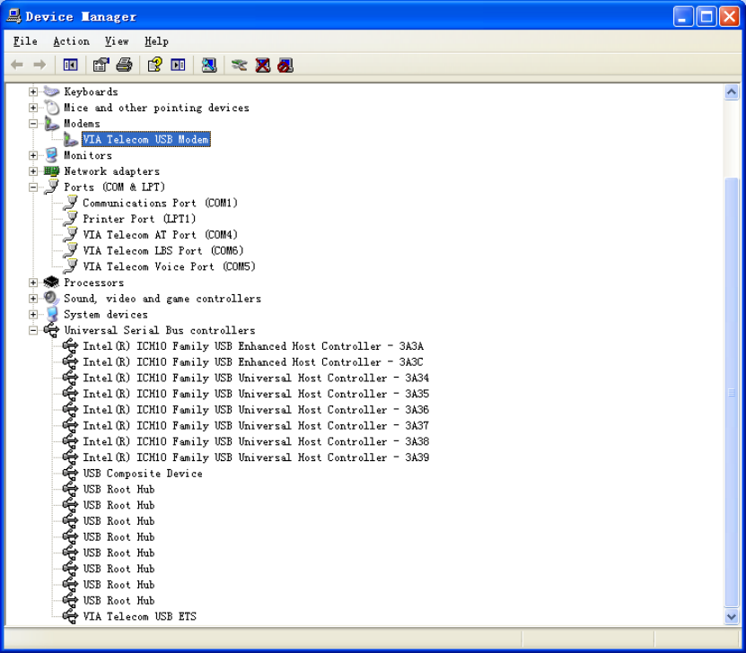 Port” and “VIA Telecom USB ETS” in Device Manager.