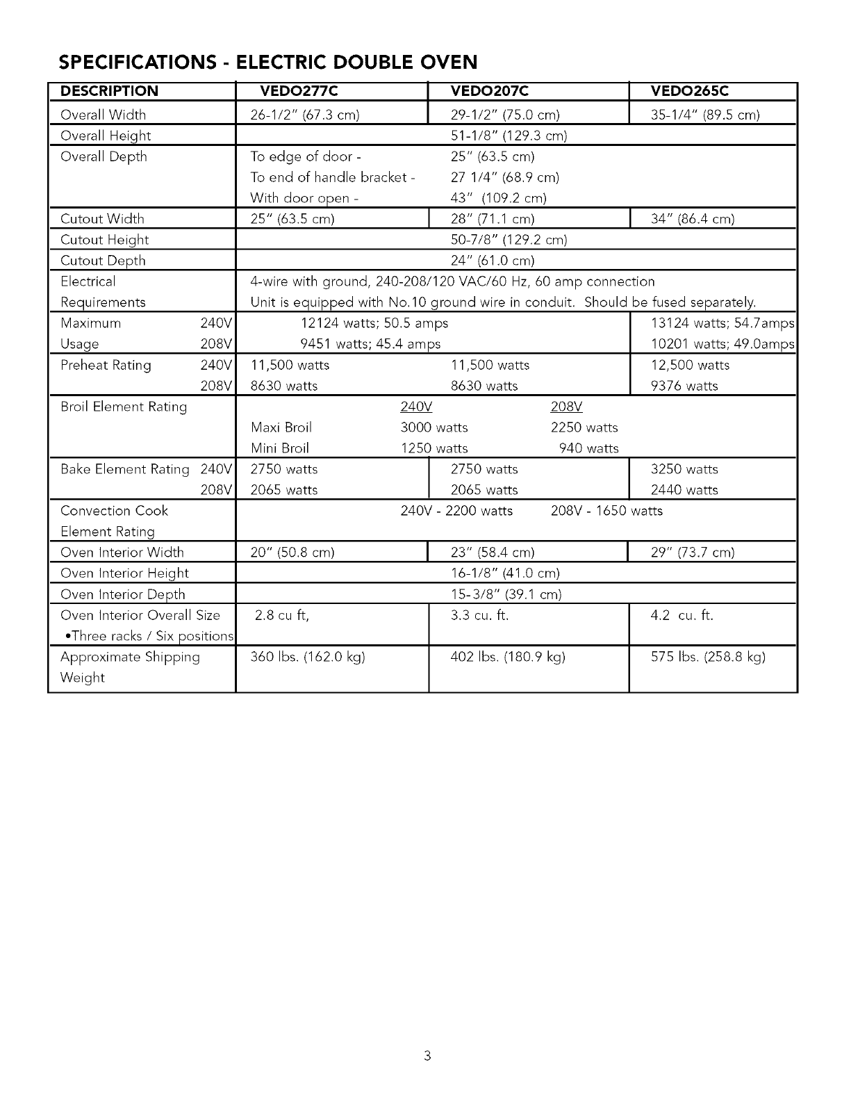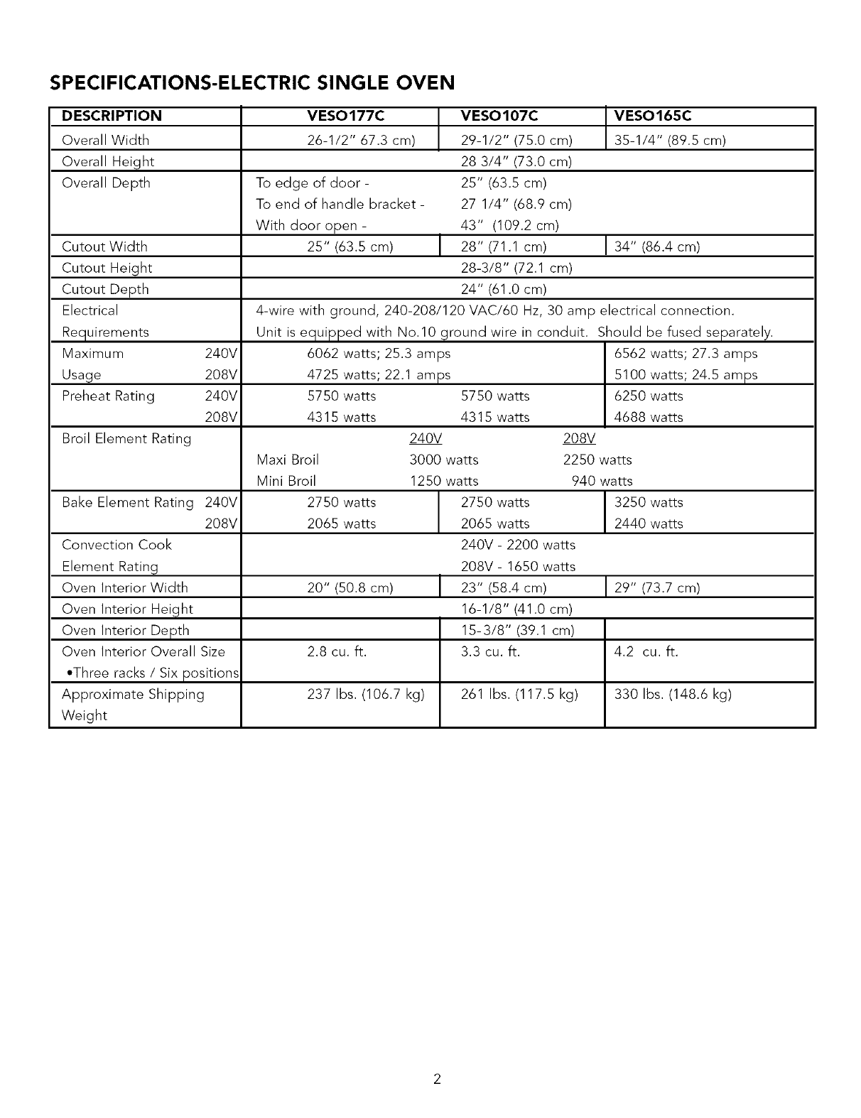 SPECIFICATIONS-ELECTRIC SINGLE OVEN