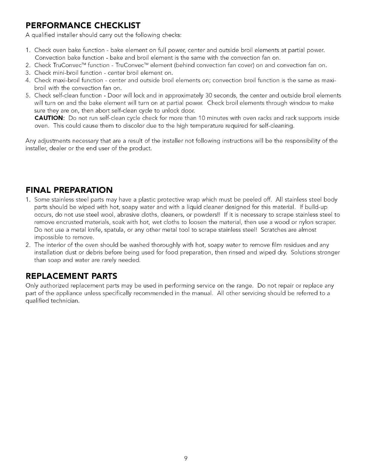 Only authorized replacement parts may be used in performing service on the range. Do not repair or replace any