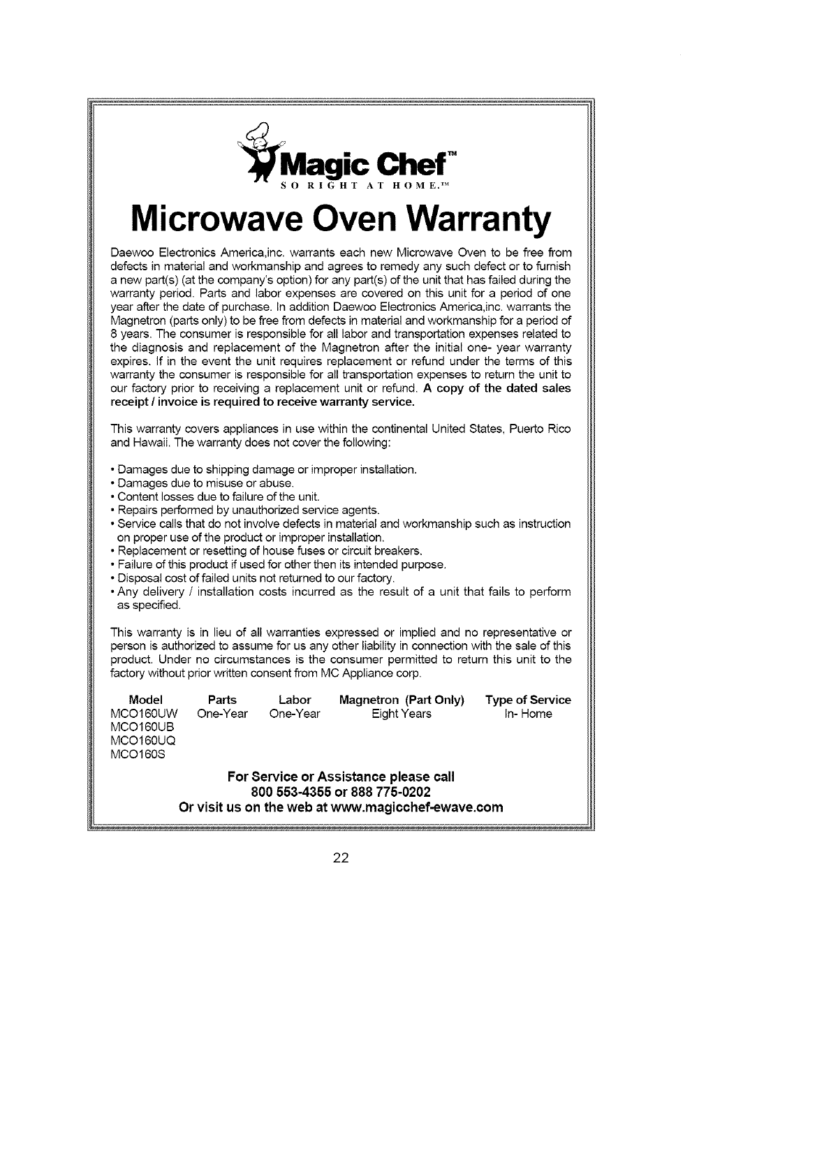 MCO160UW One-Year One-Year Eight Years In- Home