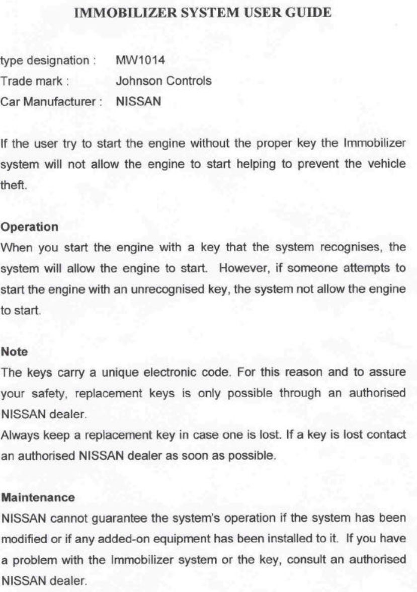 VISTEON ELECTRONICS FRANCE MW1014 Ignition Immobiliser User Manual Operator Instructions