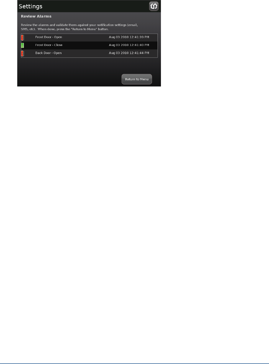 The Review Alarms screen is displayed showing a history of the zones in your system.