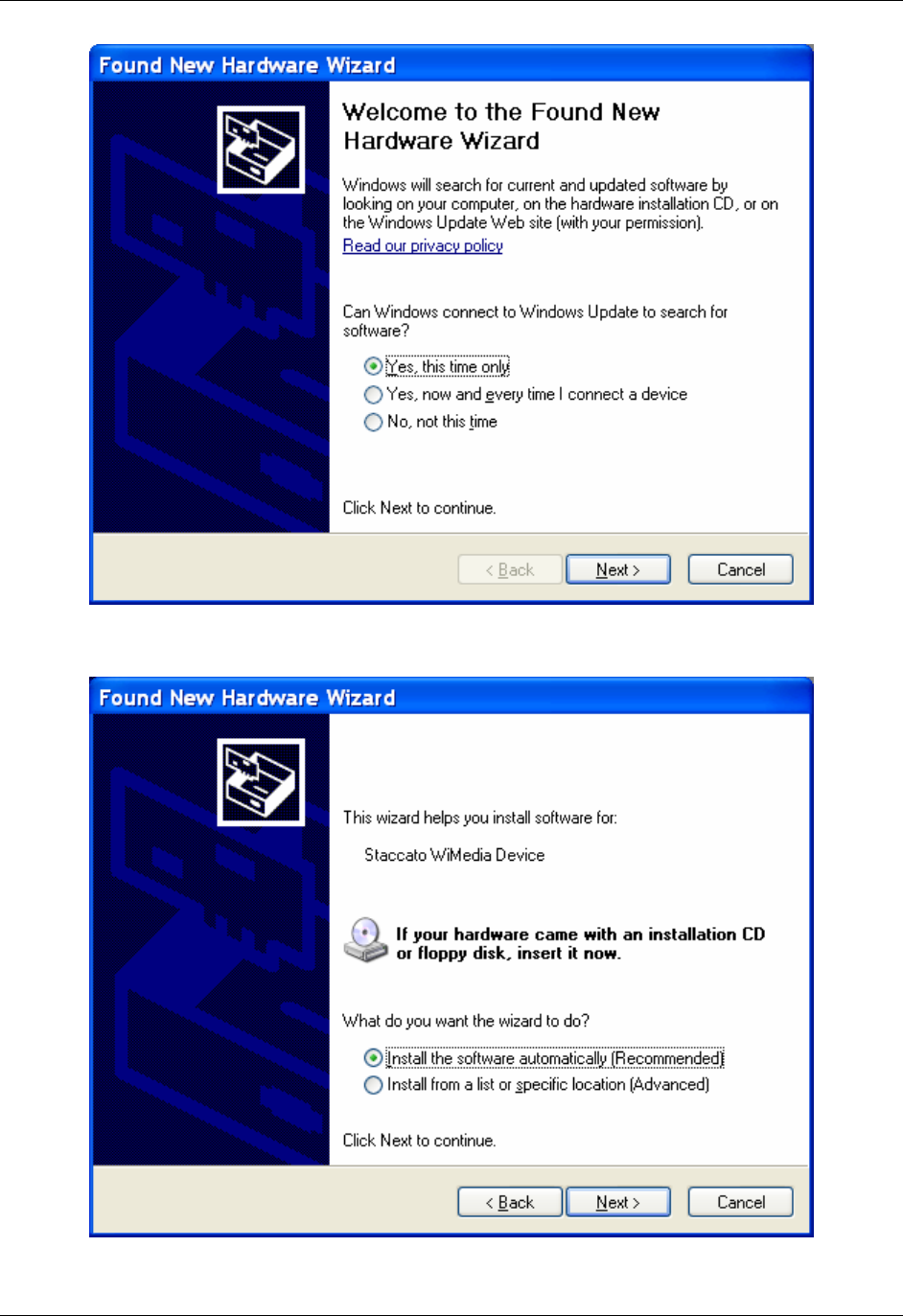 Windows will detect new hardware. When the found new hardware wizard is shown, select “Yes, this time only” in response to
