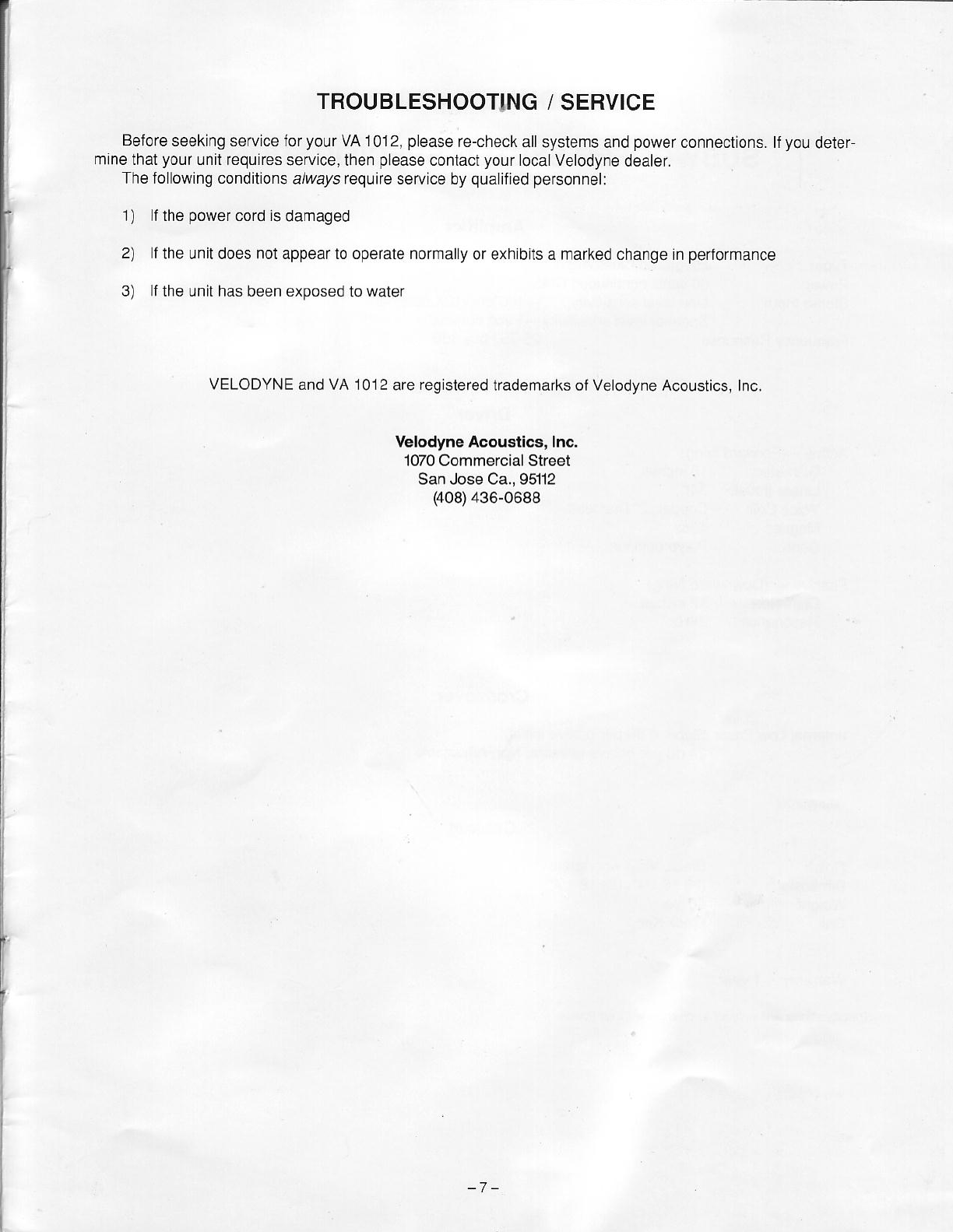 Velodyne Acoustics Va 1012 Users Manual