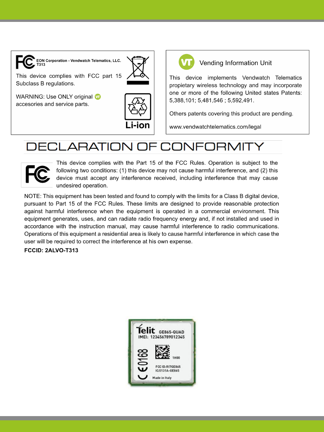 The Vendwatch VIU contains the Telit UL865-NAD cellular module (FCC ID:R17UL865NA)